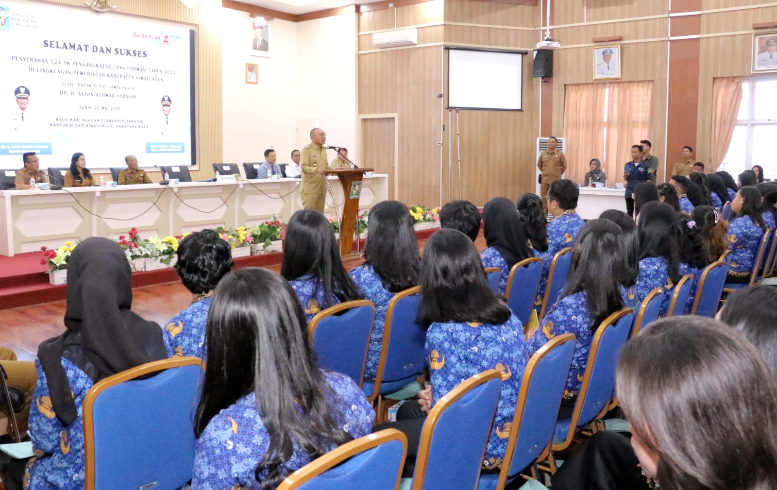 SIMALUNGUN – Bupati Simalungun, Anton Achmad Saragih menyerahkan 524 Surat Keputusan (SK) Pengangkatan Calon Pegawai Negeri Sipil (CPNS) kepada CPNS di lingkungan Pemerintah Kabupaten (Pemkab) Simalungun formasi Tahun 2024.