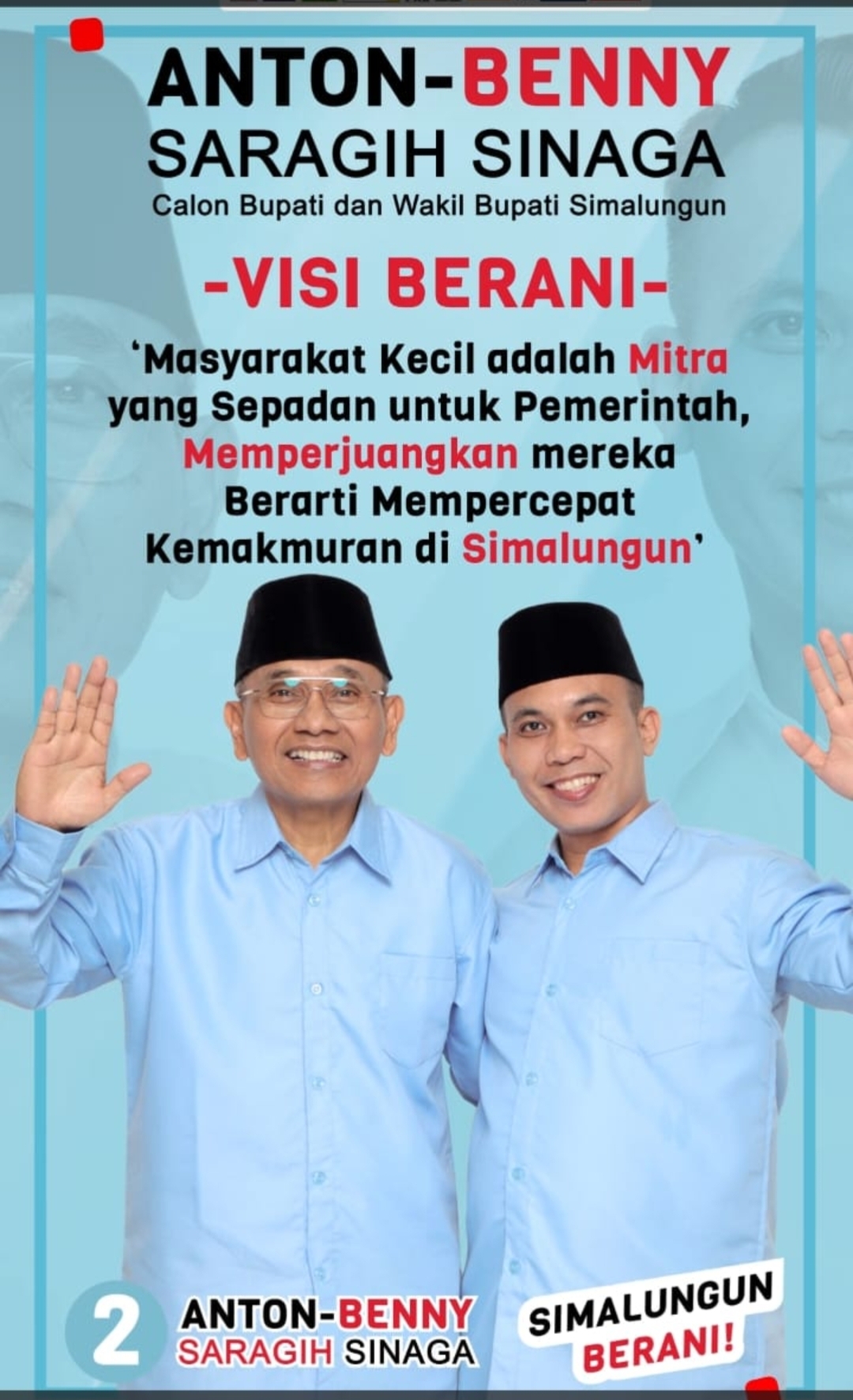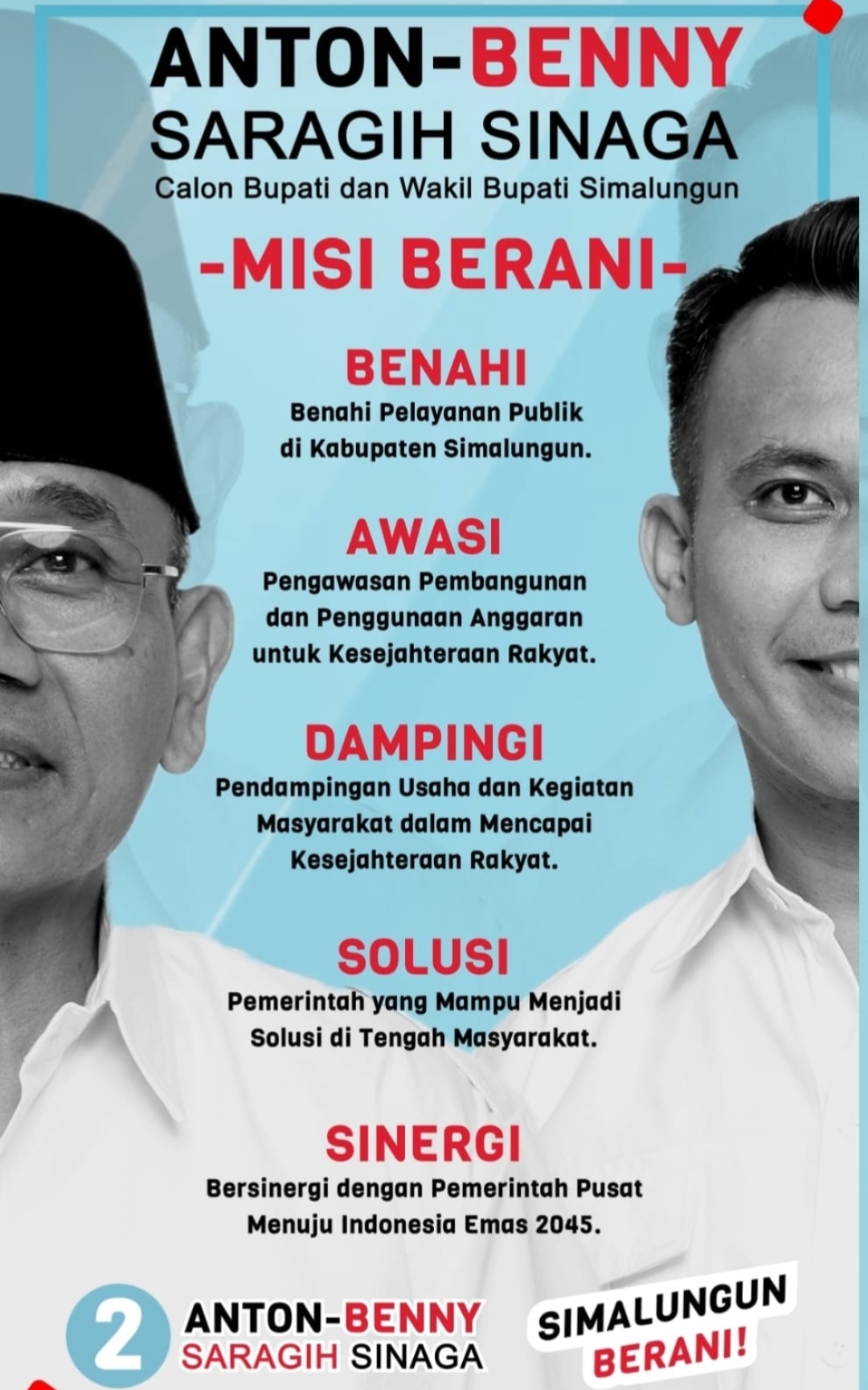 Untuk diketahui, pasangan nomor urut dua, DR H Anton Achmad Saragih dan Benny Gusman Sinaga memiliki visi dan misi menjadikan Kabupaten Simalungun harus mampu berkontribusi membangun sinergi dengan Pemerintah Pusat menuju Indonesia Emas 2045.