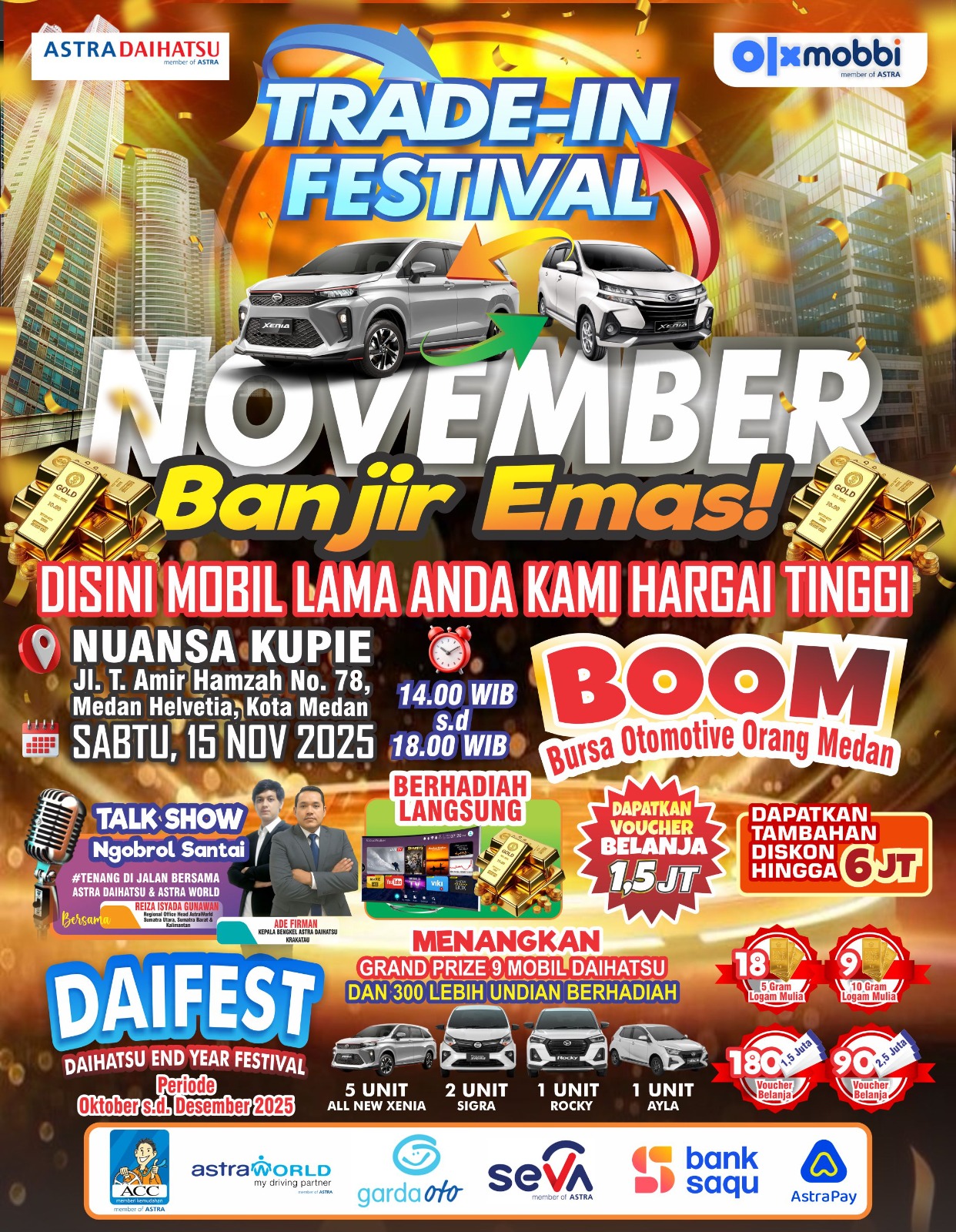 MEDAN – Astra Daihatsu Medan kembali menghadirkan kejutan spesial bagi masyarakat Sumatera Utara melalui gelaran “Trade In Festival November Banjir Emas”, yang akan berlangsung pada Sabtu, 15 November 2025, pukul 14.00–18.00 WIB di Nuansa Kupie, Jalan T. Amir Hamzah No. 78, Medan Helvetia.