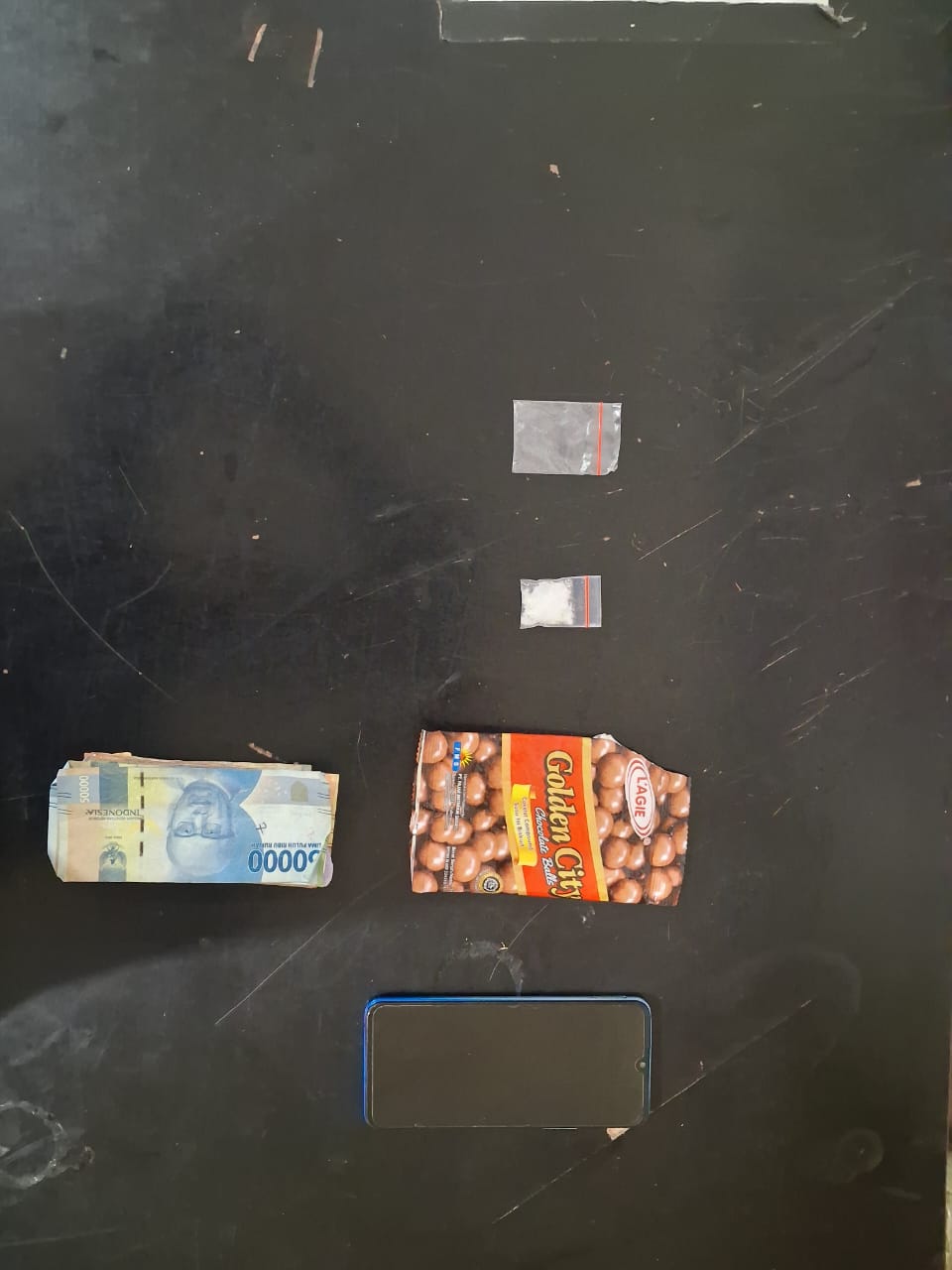 uang tunai Rp 177.000 diduga hasil penjualan, satu plastik klip kosong, satu plastik coklat merek Golden, dan satu unit handphone merek Vivo warna biru.