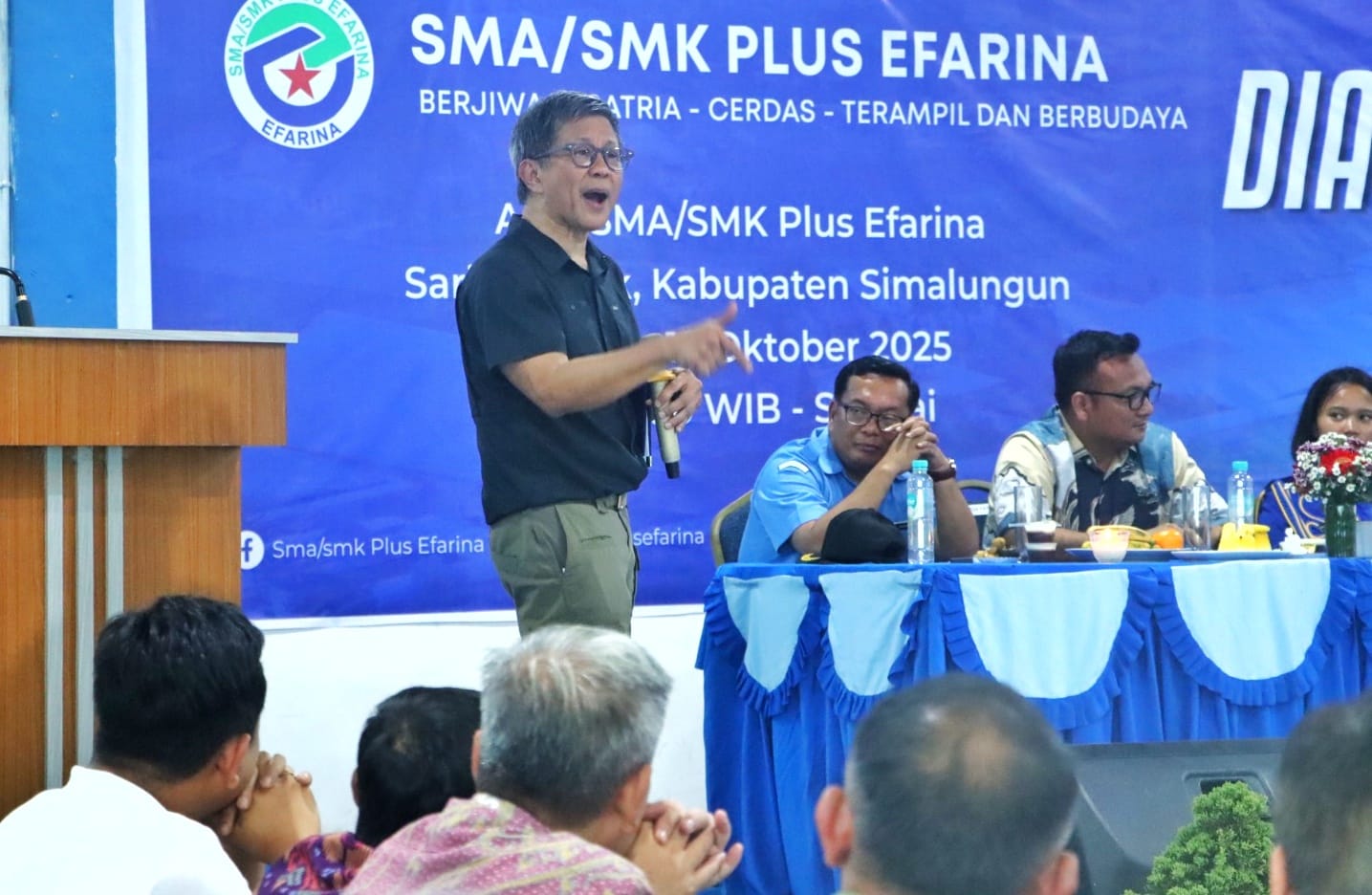 Sementara itu, Dr. JR Saragih, pendiri SMA Plus Efarina, dalam sambutannya memberikan apresiasi kepada Rocky Gerung atas kehadirannya yang memberikan nilai tambah bagi dunia pendidikan di Simalungun.