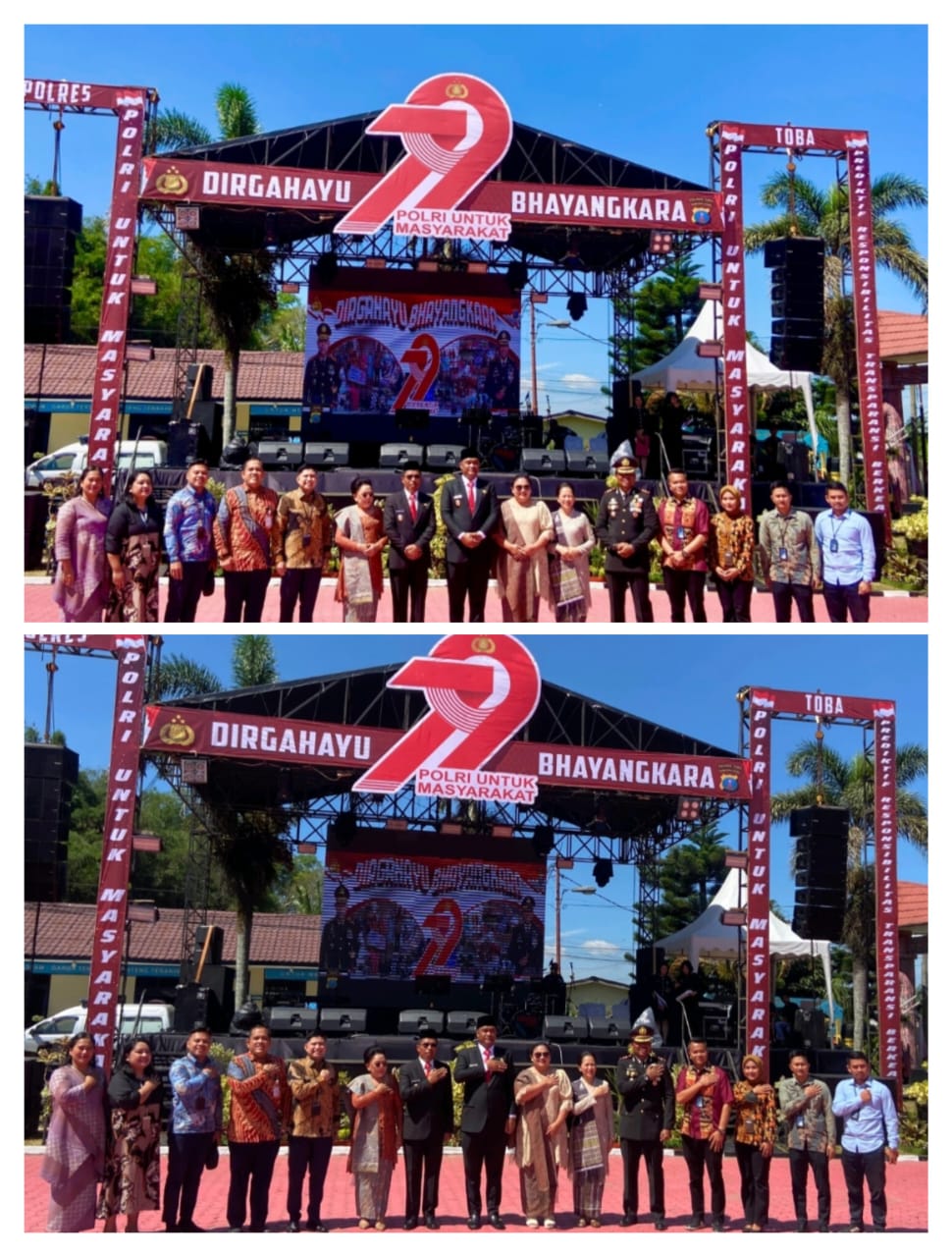 Puncak peringatan HUT Bhayangkara digelar di Lapangan Apel Mako Polres Toba, Desa Narumonda IV, Kecamatan Siantar Narumonda. Acara berlangsung sejak pukul 10.00 WIB hingga selesai, dengan dihadiri ratusan undangan dari berbagai kalangan. Salah satu tamu kehormatan adalah perwakilan dari BRI Cabang Balige, yakni Pimpinan Cabang Namal Kautsar, yang hadir bersama Ronaldus Sitanggang (RMTF) dan Ambiya Wal Mursalin (RM Konsumer Briguna).