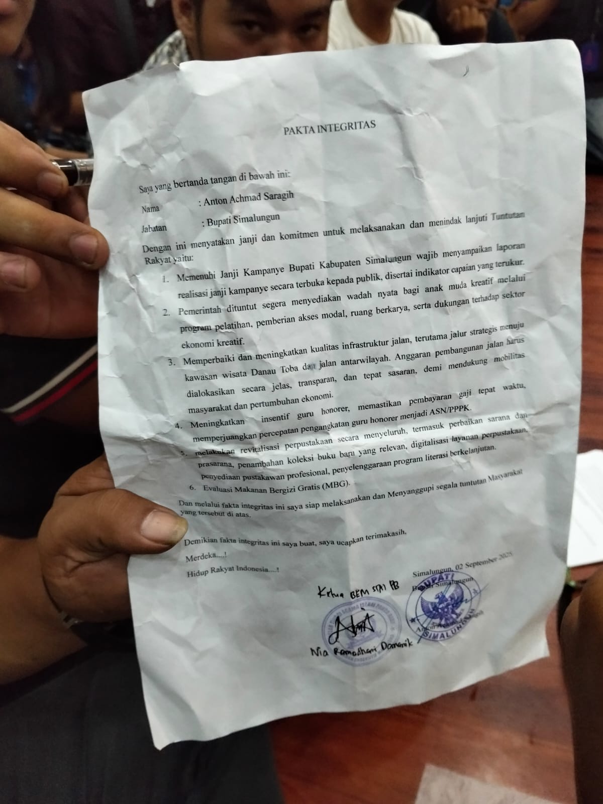 Selain menyampaikan tuntutan, mahasiswa juga menyerahkan fakta integritas kepada Bupati Simalungun sebagai bentuk komitmen agar aspirasi mereka benar-benar ditindaklanjuti.