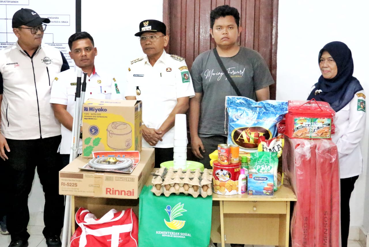 PARAPAT – Bupati Simalungun Antos Achmad Saragih didampingi Kadis Sosial, Osnidar Marpaung dan Camat Girsang Sipangan Bolon, Viktor Sijabat, menyalurkan bantuan logistik dan atensi yang bersumber dari kementerian sosial (Kemensos) Sentra Bahagia Medan.
