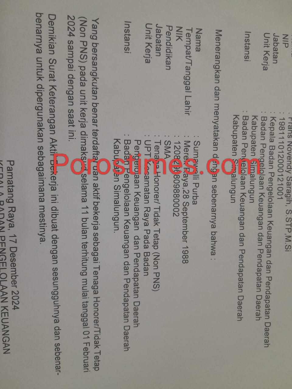 SIMALUNGUN – Kabar mengejutkan datang dari lingkungan Pemerintah Kabupaten (Pemkab) Simalungun. Seorang tenaga honorer bernama Sumawelli Purba, yang bertugas di UPT Kecamatan Raya pada Badan Pengelolaan Keuangan dan Pendapatan Daerah (BPKPD) Kabupaten Simalungun, diduga lolos seleksi administrasi dan bahkan telah mengikuti ujian Pegawai Pemerintah dengan Perjanjian Kerja (PPPK). Padahal, masa kerjanya sebagai honorer baru memasuki bulan ke-11.