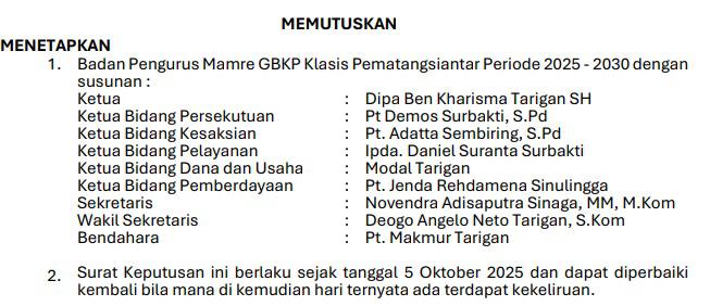 Dari hasil musyawarah tersebut, Dipa Tarigan terpilih secara resmi sebagai Ketua Mamre se-Klasis Pematangsiantar. Ia akan memimpin organisasi kaum bapak ini bersama jajaran pengurus lainnya untuk memperkuat pelayanan dan persekutuan dalam lingkup GBKP.