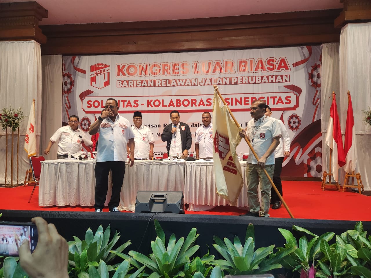 JAKARTA – Barisan Relawan Jalan Perubahan (BaraJP) secara resmi menetapkan Frans Ansanay sebagai Ketua Umum periode 2025–2030 dalam Kongres Luar Biasa (KLB) yang digelar di Padepokan Pencak Silat, TMII, Jakarta, Kamis (19/6/2025). KLB ini sekaligus mengukuhkan komitmen kuat seluruh relawan dalam mendukung pemerintahan Prabowo Subianto dan Gibran Rakabuming Raka.
