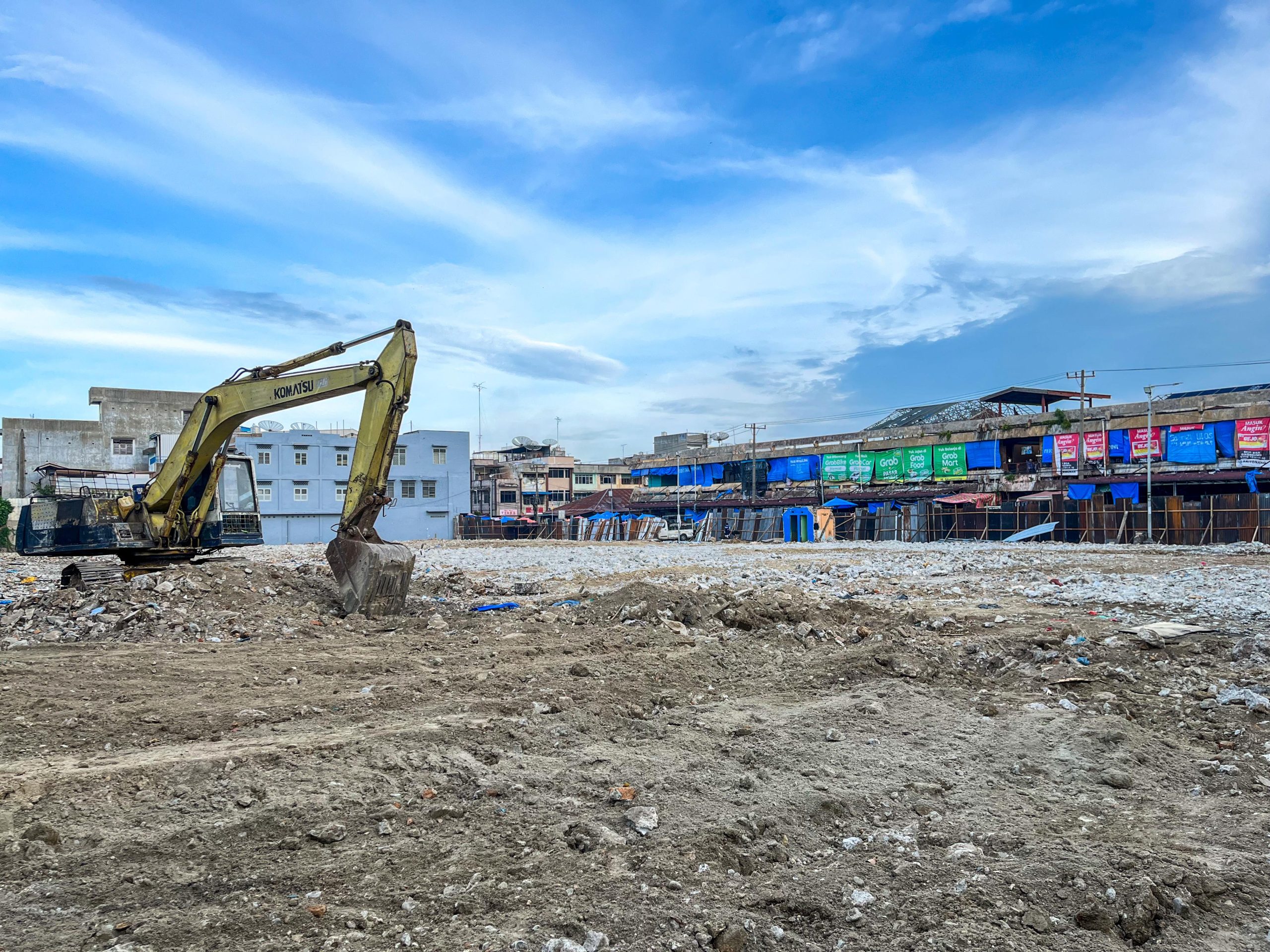 Tahapan berikutnya adalah pembersihan material bongkaran dan perataan lahan dengan proses cut and fill untuk galian dan timbunan, dilanjutkan pemadatan menggunakan alat berat.