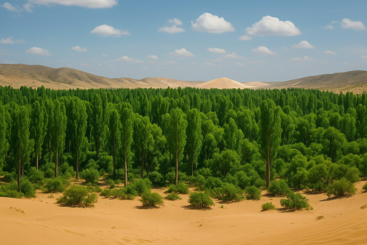 Proyek yang disebut “Green Wall of China” atau Tembok Hijau China dimulai pada awal tahun 2000-an sebagai upaya pemerintah untuk menahan laju gurun Gobi yang terus meluas ke wilayah pemukiman. Dengan memanfaatkan teknologi penanaman berbasis mikroba tanah dan pengairan bawah permukaan, gurun yang dulu kering dan gersang kini berubah menjadi kawasan subur yang dipenuhi pepohonan poplar dan semak hijau.