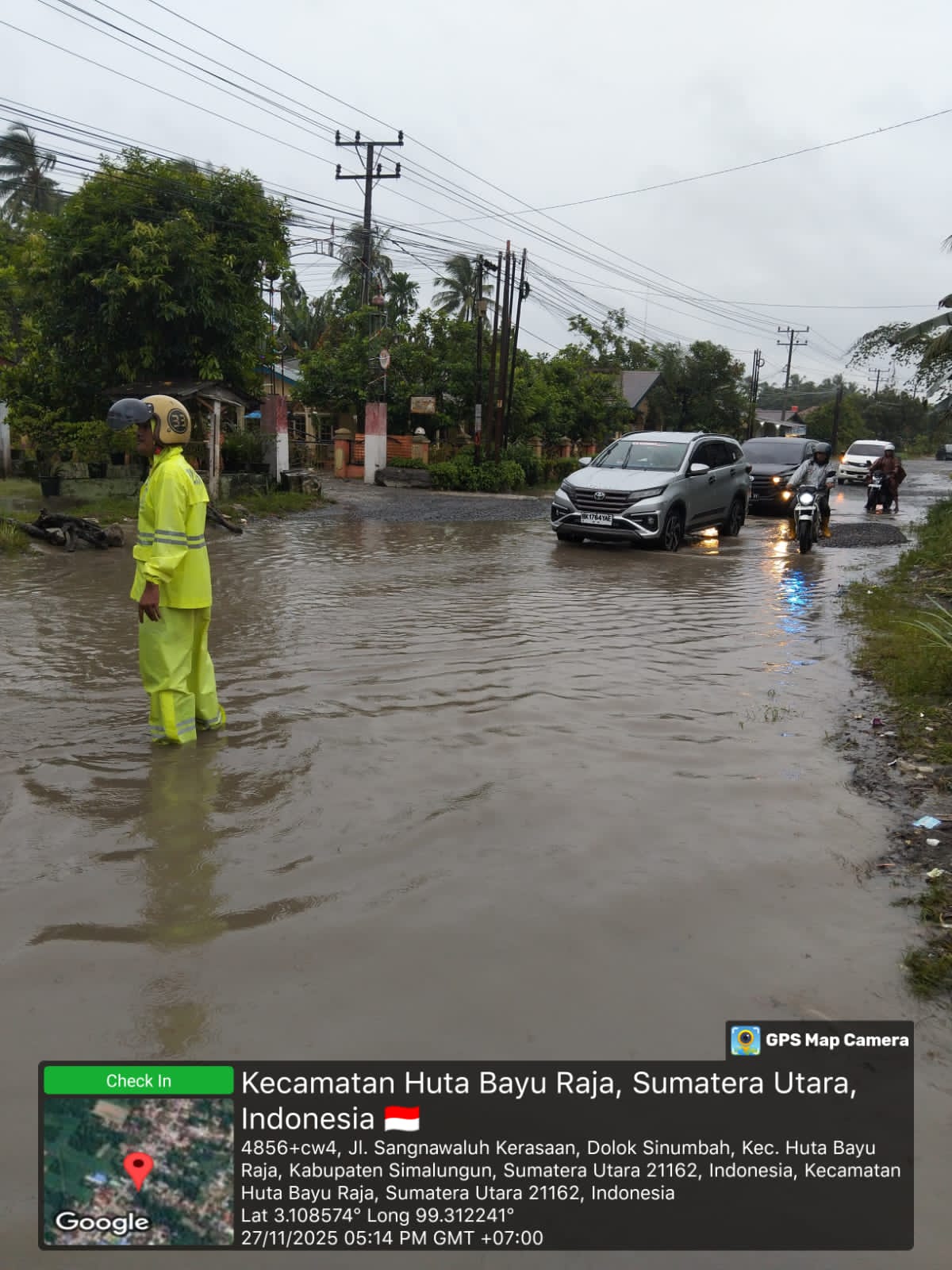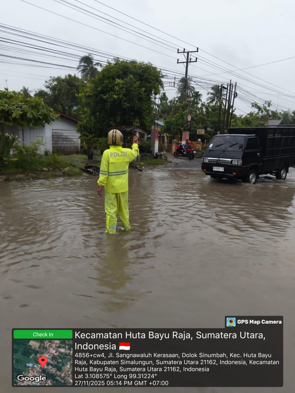 SIMALUNGUN – Hujan deras yang mengguyur wilayah Kecamatan Bandar dan Perdagangan pada Kamis sore (27/11/2025) menyebabkan ruas Jalan Umum KM 35,5–36 di Huta II Gg PM, Nagori Marihat Bandar, tergenang air setinggi 20–25 cm sepanjang kurang lebih 50 meter. Untuk menghindari kemacetan dan potensi kecelakaan, dua personel Polsek Perdagangan, Aiptu Idris F. Pasaribu dan Aiptu Hasoloan Sitinjak, langsung turun ke lokasi untuk melakukan pengaturan lalu lintas di tengah genangan.