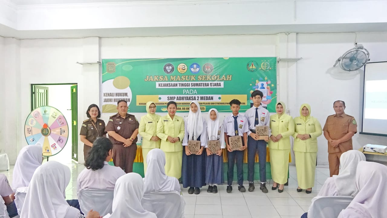 Ketua Ikatan Adhyaksa Dharmakarini (IAD) Wilayah Sumatera Utara, Ny. Tiurmaida Harli SiregarNimor dari kiri) Bersama Plh. Kasi Penerangan Hukum dan Siswa/i SMP Swasta Adhyaksa 2 Medan