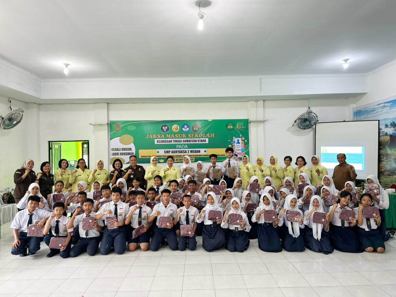 MEDAN — Ketua Ikatan Adhyaksa Dharmakarini (IAD) Wilayah Sumatera Utara, Ny. Tiurmaida Harli Siregar, menghadiri kegiatan Penyuluhan Hukum tentang Pencegahan Narkoba di SMP Swasta Adhyaksa 2 Medan, Jalan HM Said No. 23, Kecamatan Medan Timur, Kota Medan.