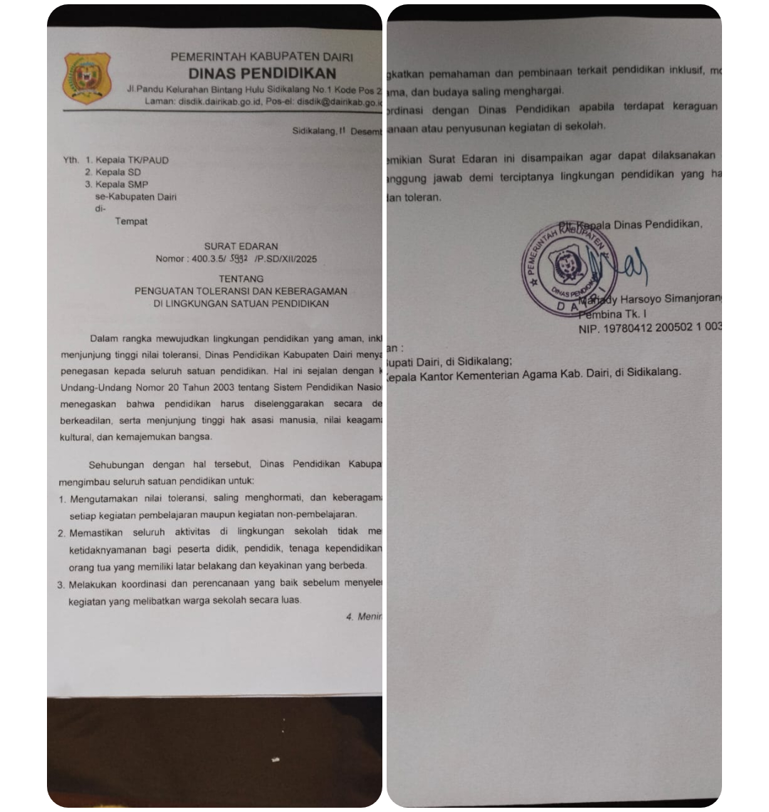 SIDIKALANG – Menyikapi viralnya sebuah video sensitif di media sosial, Dinas Pendidikan Kabupaten Dairi mengeluarkan Surat Edaran Nomor 400.3.5/5992/P.SD/XII/2025 tentang Penguatan Toleransi dan Keberagaman di Lingkungan Satuan Pendidikan. Surat edaran tersebut ditujukan kepada seluruh kepala sekolah dan guru di Kabupaten Dairi, untuk segera ditindaklanjuti demi menjaga masa depan peserta didik serta menciptakan suasana pendidikan yang aman dan inklusif.