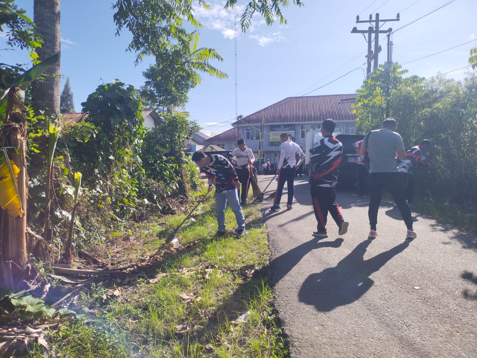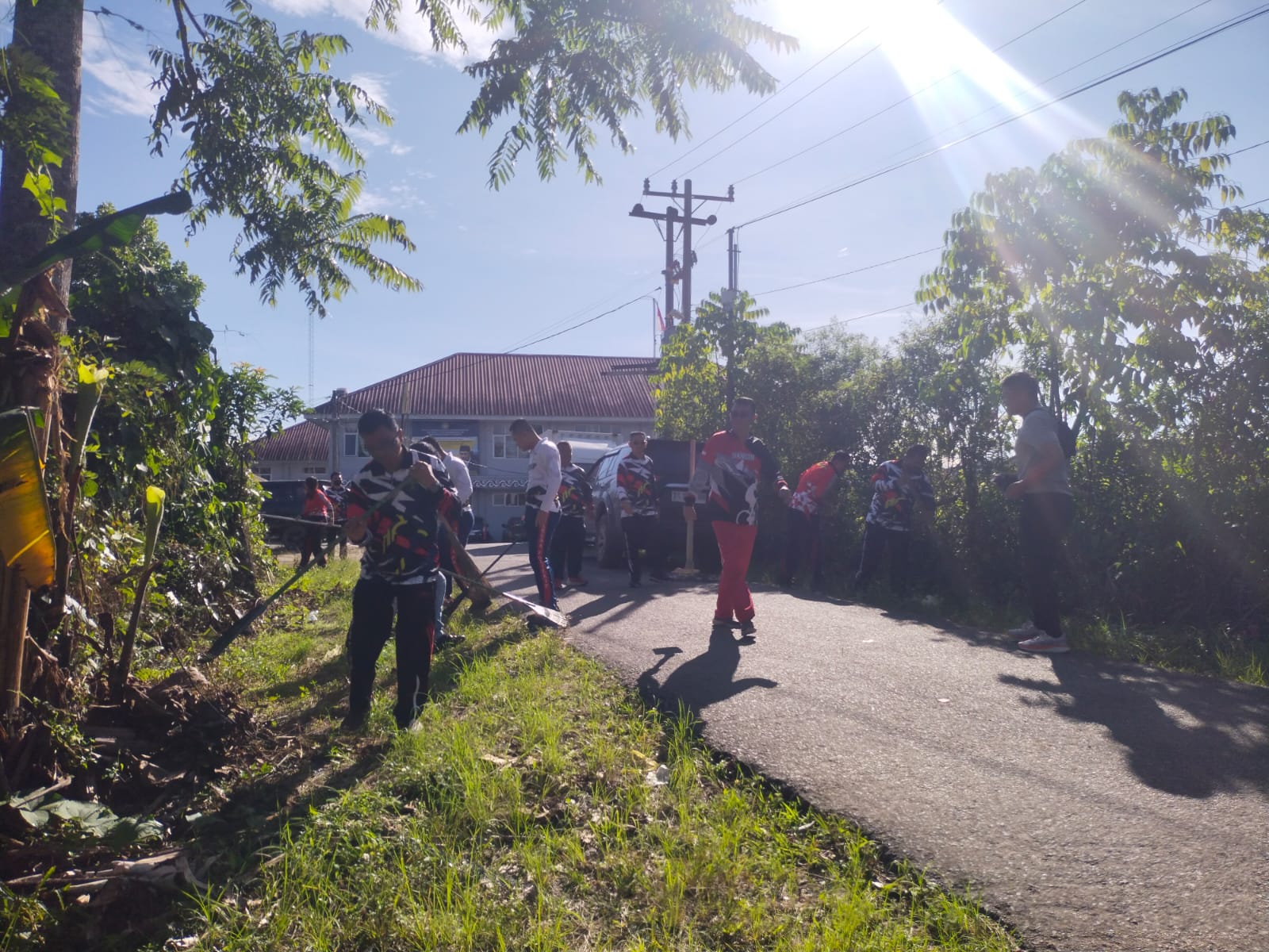 Para pegawai tampak semangat membabat rumput dan membersihkan sampah di sekitar jalan menuju Lapas.