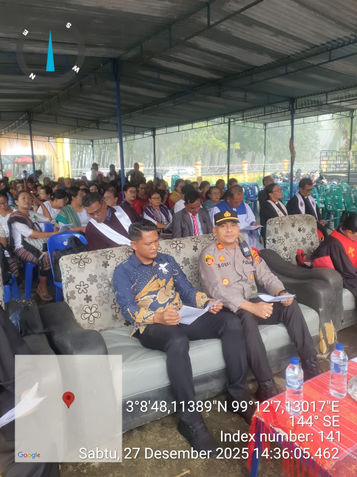 SIMALUNGUN – Wujud kepedulian dan solidaritas terhadap korban bencana alam ditunjukkan dalam Perayaan Natal Oikumene Kecamatan Bandar Huluan. Kapolsek Perdagangan AKP Ibrahim Soepi, SH, MH., bersama Kanit Samapta AIPTU James Simanjuntak, SH., menghadiri perayaan Natal sekaligus doa bersama bagi korban bencana alam di Sumatera Utara, Sumatera Barat, dan Aceh, Sabtu (27/12/2025).
