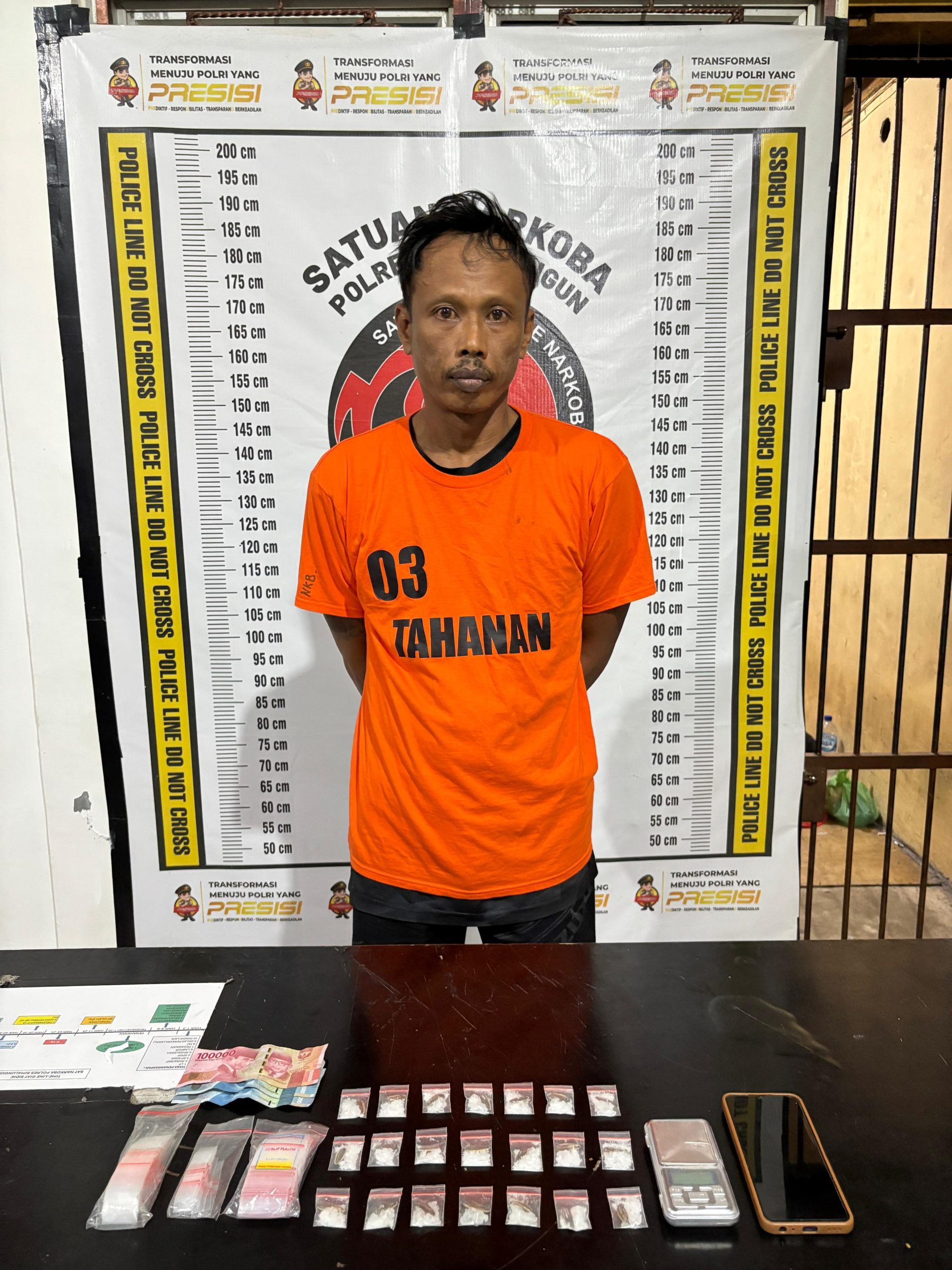 Saat dilakukan penggeledahan, petugas menemukan sejumlah barang bukti yang diduga kuat sebagai barang haram, yaitu 21 (dua puluh satu) bungkus plastik klip sedang diduga berisi Narkotika jenis Sabu berat total (Brutto 32,75 Gram), 1 (satu ) unit Hp Android merk Vivo, 1 (satu) unit timbangan digital, 3 (tiga) bal plastik klip kosong, Uang tunai diduga hasil penjualan Rp 200.000.
