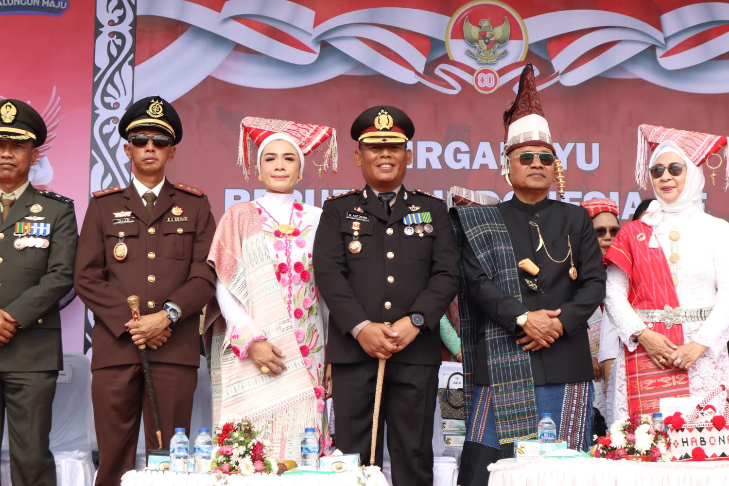 SIMALUNGUN – Upacara Peringatan Hari Ulang Tahun ke-80 Kemerdekaan Republik Indonesia di Kabupaten Simalungun berlangsung khidmat dan penuh makna, Minggu (17/8/2025). Kapolres Simalungun AKBP Marganda Aritonang, S.H., S.I.K., M.M., hadir bersama Ketua Bhayangkari Cabang Simalungun, Ny. Nanik M. Aritonang, sebagai wujud komitmen Polri dalam menghormati jasa para pahlawan dan menjaga nilai-nilai kemerdekaan.