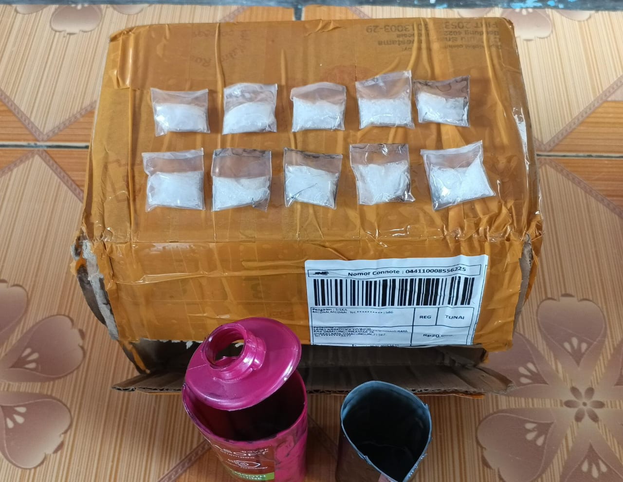 “Dari hasil penggeledahan, ditemukan 10 bungkusan berisi kristal putih yang diduga kuat narkotika jenis sabu, dimasukkan ke dalam dua botol shampoo,” ujar Freddy.