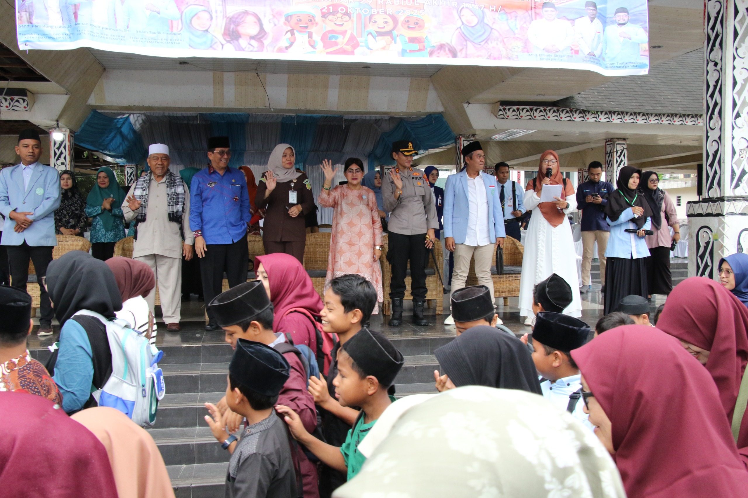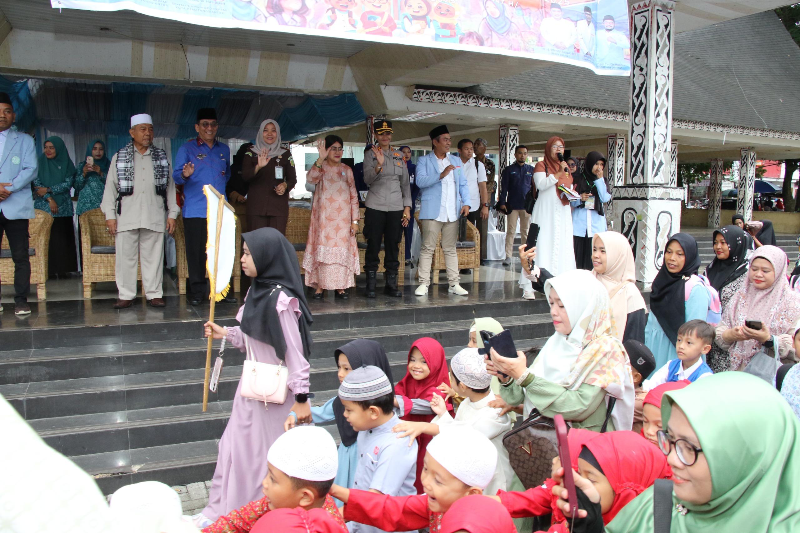 “Dengan menyebut nama Tuhan Yang Maha Esa, maka pelepasan Pawai Ta’aruf Festival Anak Sholeh Indonesia ke-XIII BKPRMI Kota Pematangsiantar Tahun 2025 dengan ini saya lepas,” ucap Ny. Liswati sambil mengangkat bendera start.
