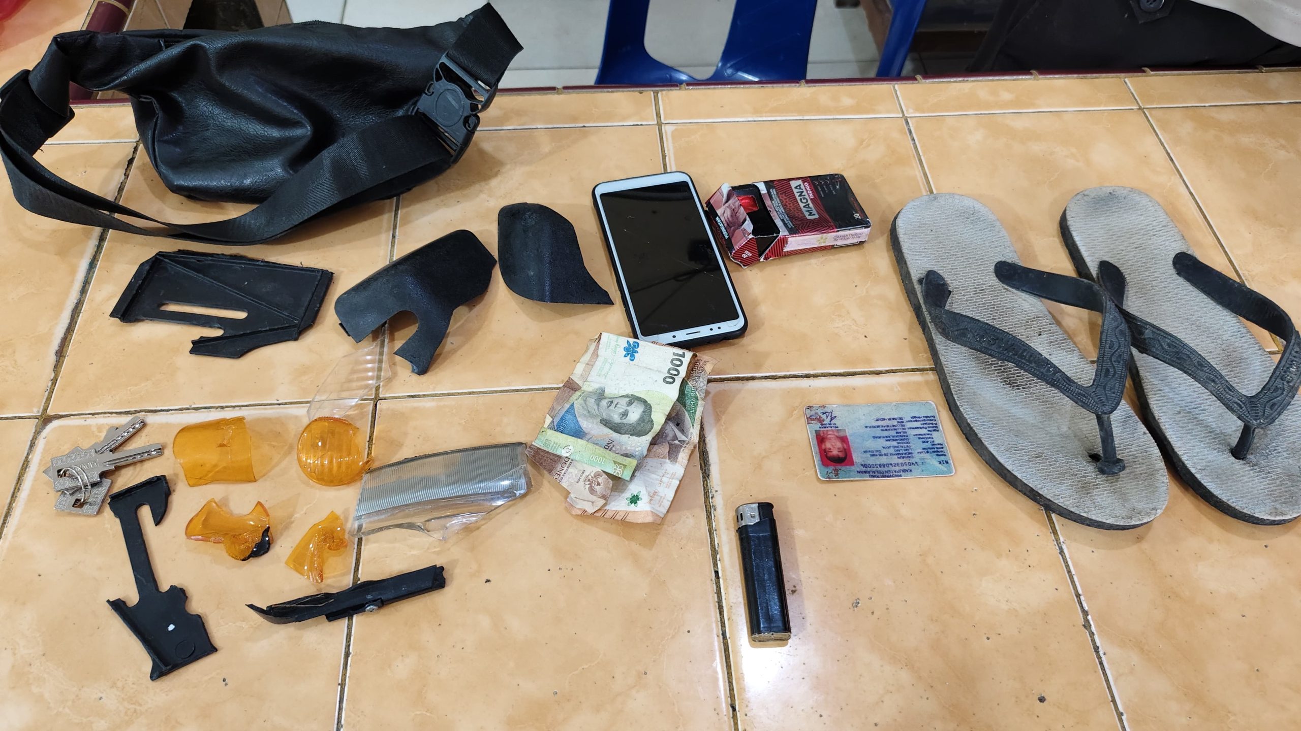 Polisi turut mengamankan sejumlah barang bukti di lokasi kejadian. Di antaranya satu tas selempang hitam berisi KTP korban, satu unit handphone hitam, uang tunai Rp11.000, satu bungkus rokok merek Magna, satu set kunci rumah, serta satu buah korek api. Tak jauh dari mayat, juga ditemukan serpihan plastik yang diduga merupakan pecahan lampu kendaraan bermotor.