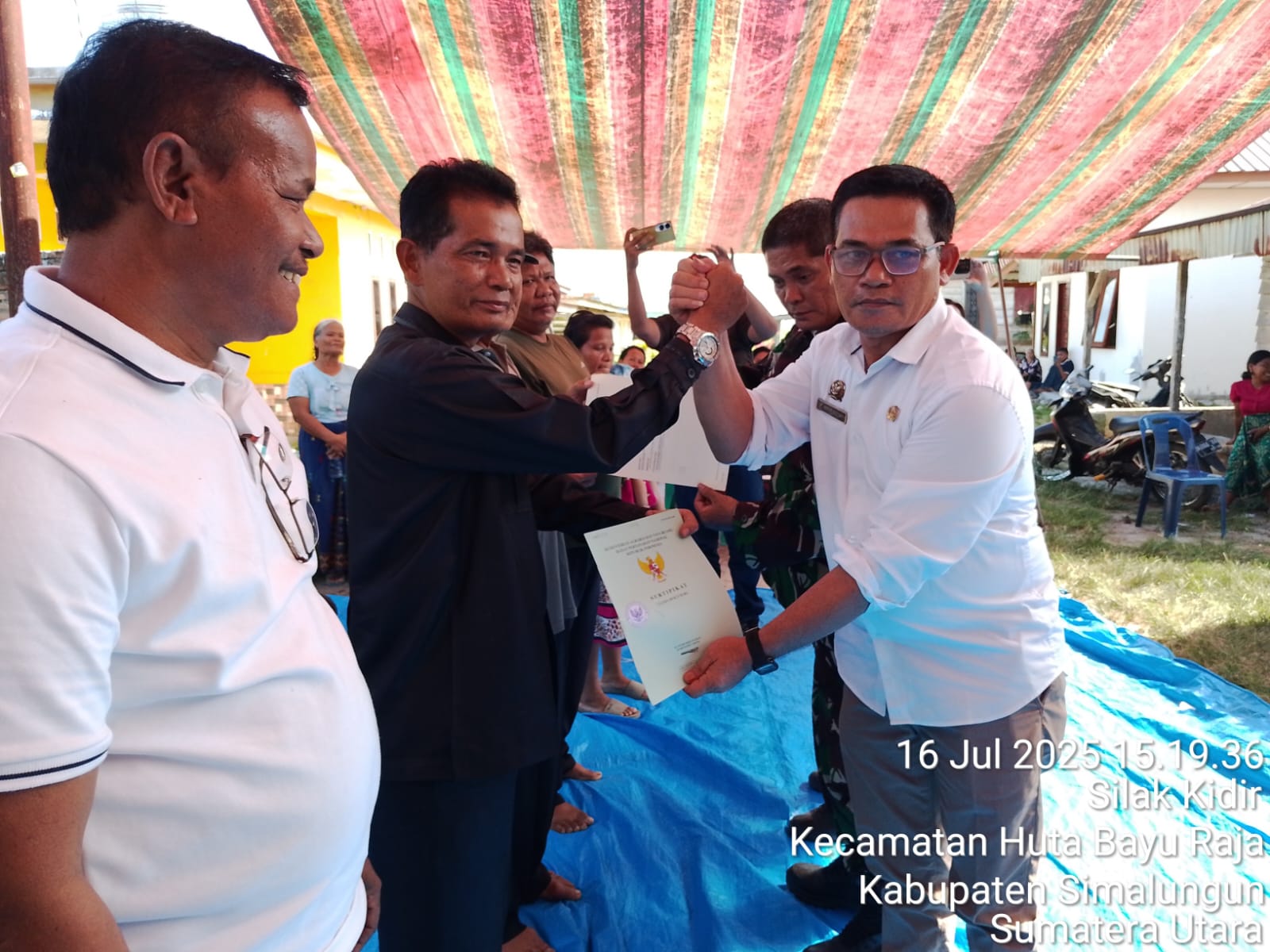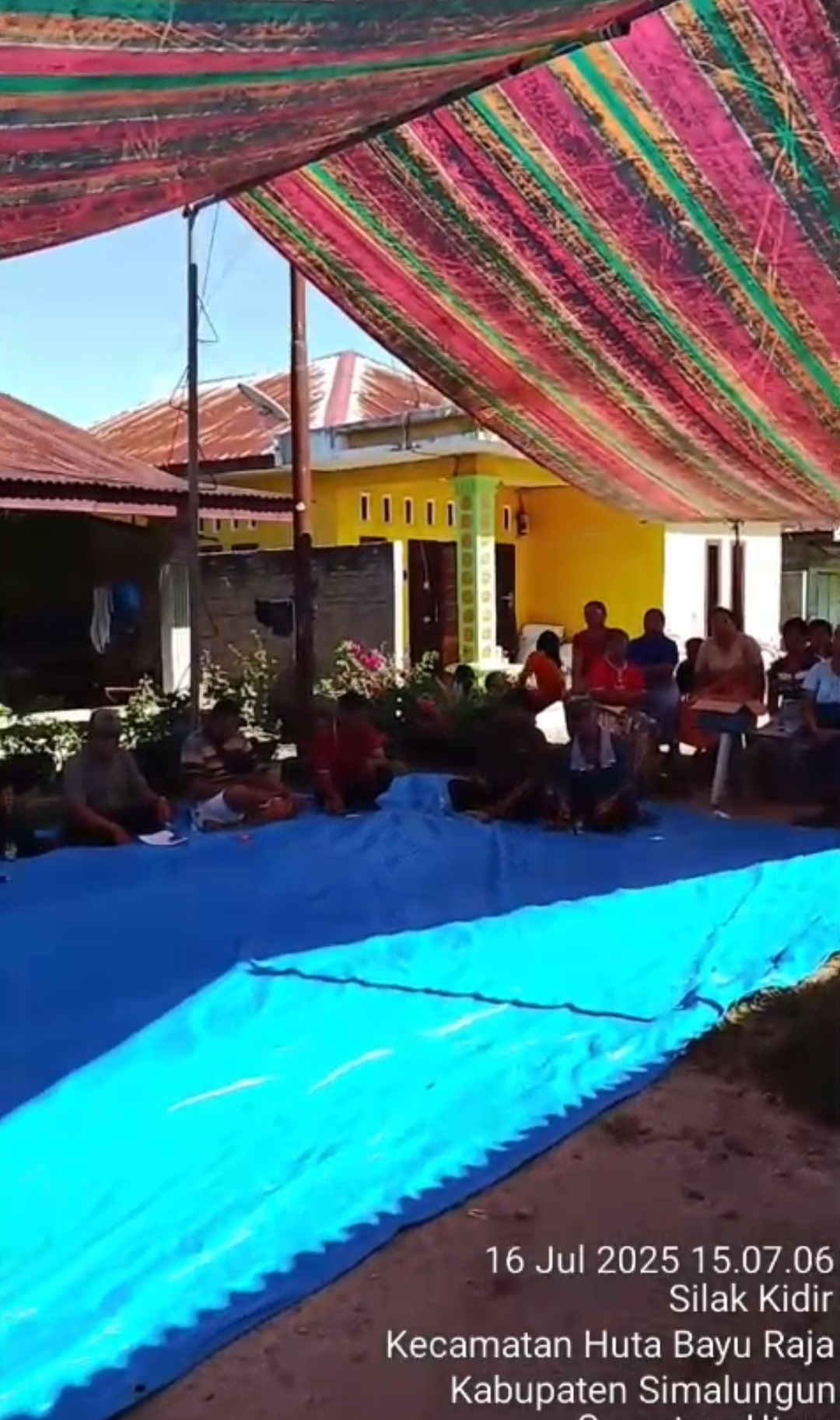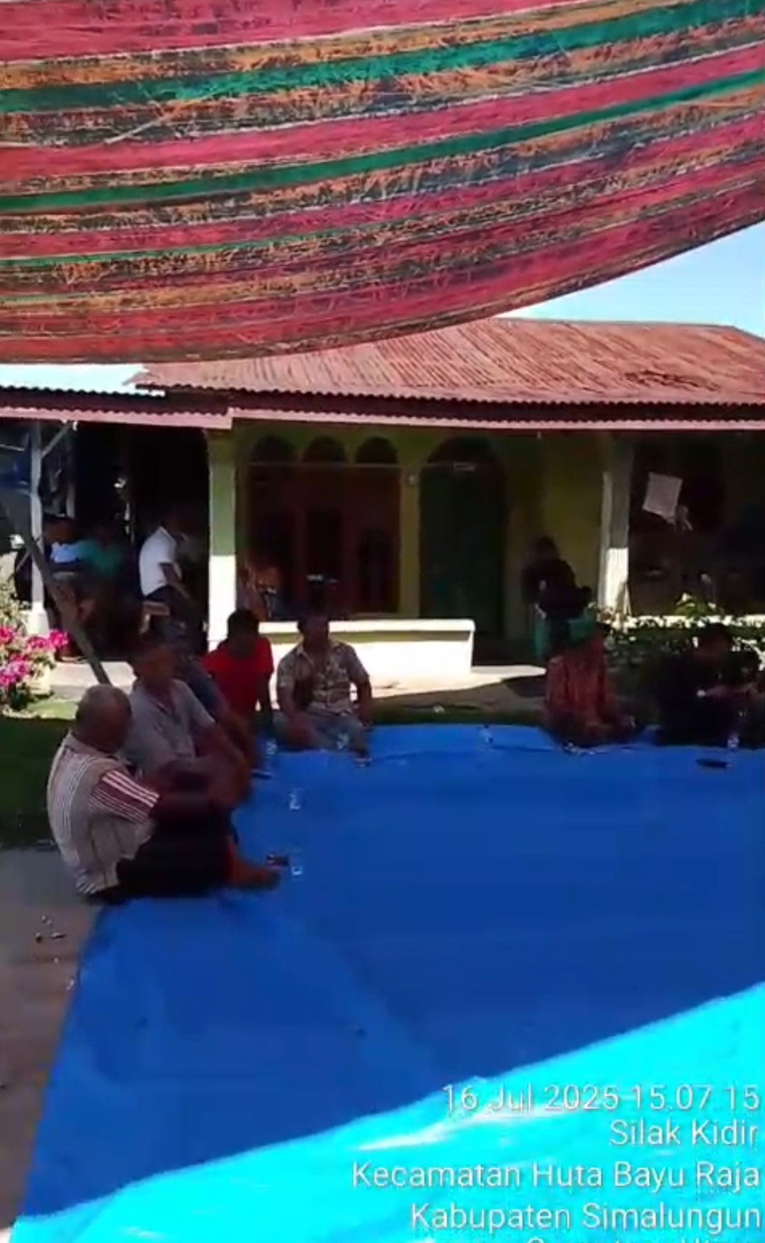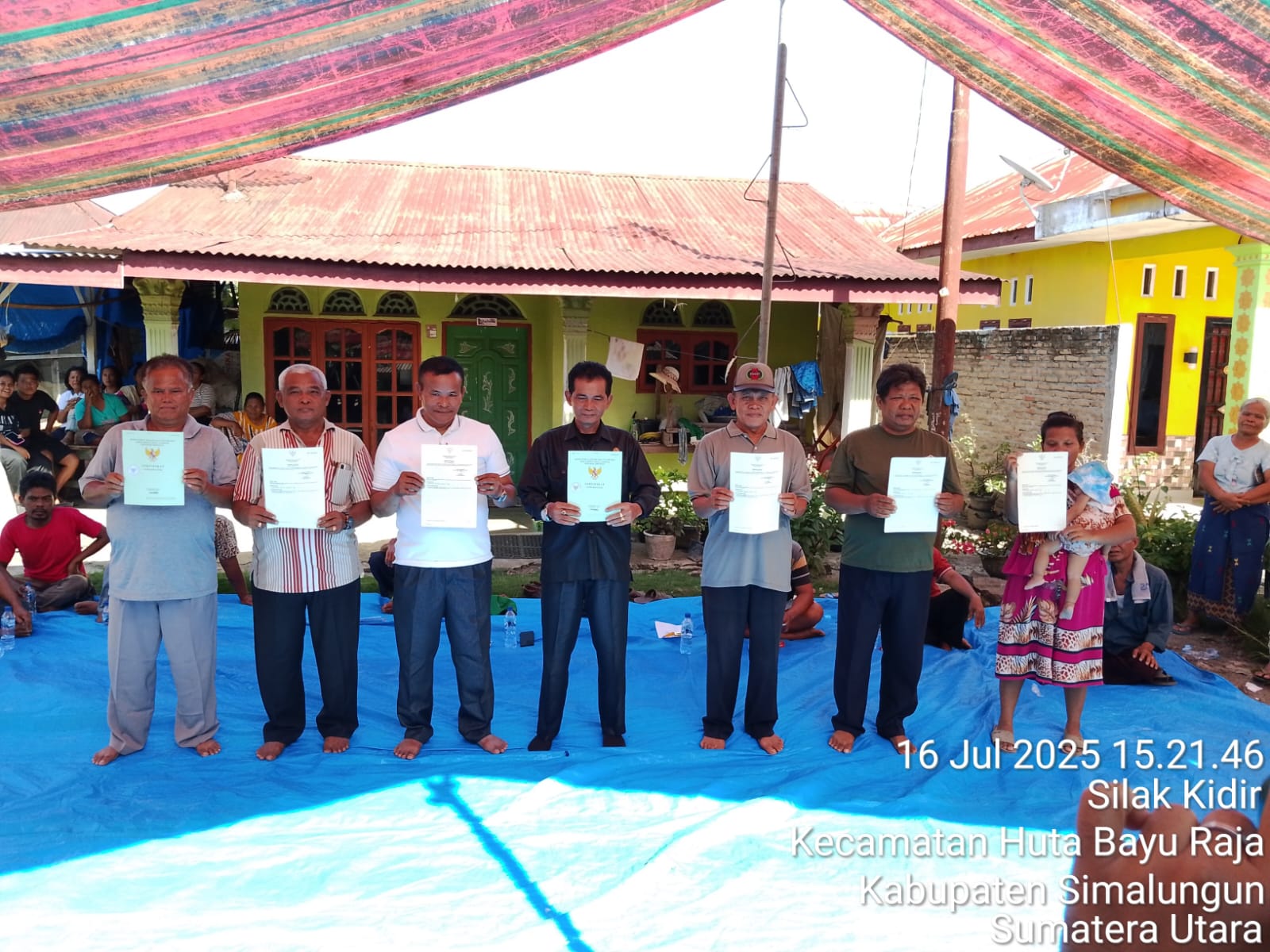 SIMALUNGUN – Pangulu (Kepala Desa) Nagori Silakkidir, Heplin Marpaung, memberikan penjelasan kepada warga Huta III, Nagori Silakkidir, Kecamatan Huta Bayu Raja, terkait proses dan asal-usul alas hak atas tanah sebagai dasar untuk memperoleh Sertifikat Hak Milik (SHM) dari Badan Pertanahan Negara (BPN).