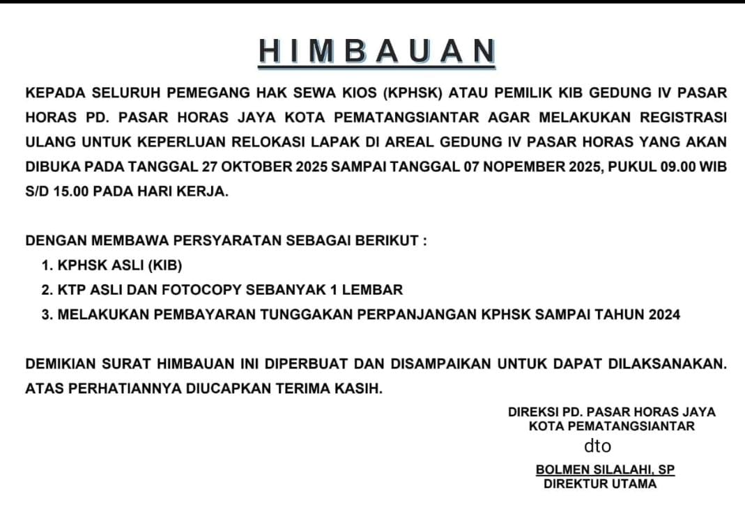 PEMATANGSIANTAR — Manajemen Perusahaan Daerah Pasar Horas Jaya (PD PHJ) mengimbau seluruh pemilik Kartu Pemakaian Hak Sewa Kios (KPHSK) Gedung IV Pasar Horas agar segera melakukan registrasi sebagai bagian dari proses relokasi dan penempatan lapak di area bekas Gedung IV Pasar Horas.