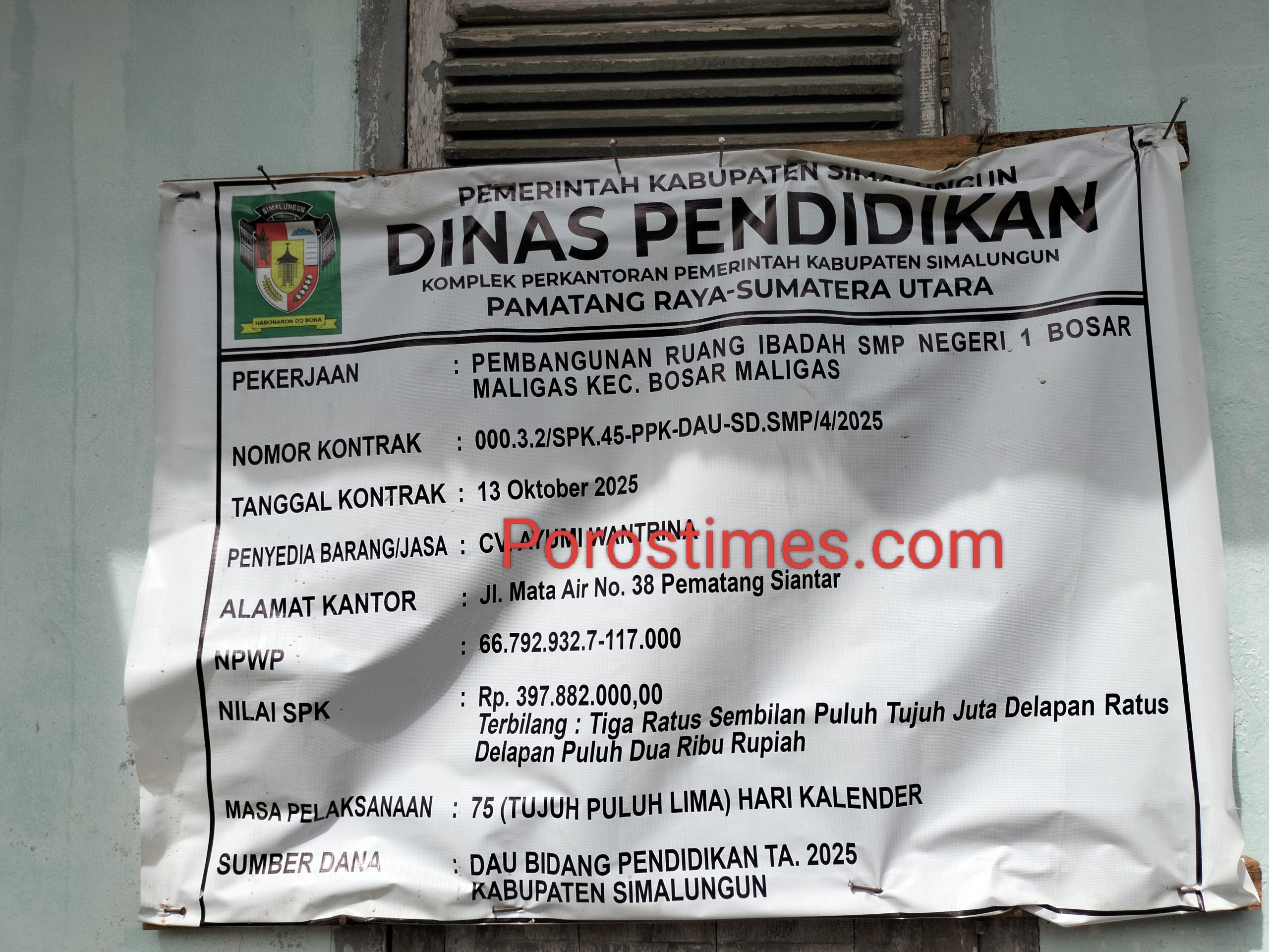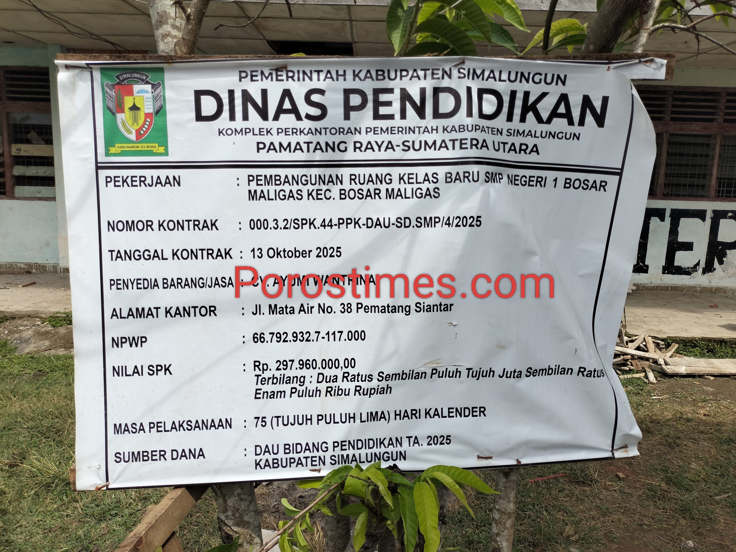 Proyek tersebut dikerjakan oleh CV Ayumi Wantrina, perusahaan yang beralamat di Kota Pematangsiantar. Adapun pekerjaan yang sedang berlangsung meliputi pembangunan Ruang Ibadah SMPN 1 Bosar Maligas dengan pagu anggaran sebesar Rp 397.882.000, serta pembangunan Ruang Kelas Baru (RKB) dengan nilai Rp 297.960.000.
