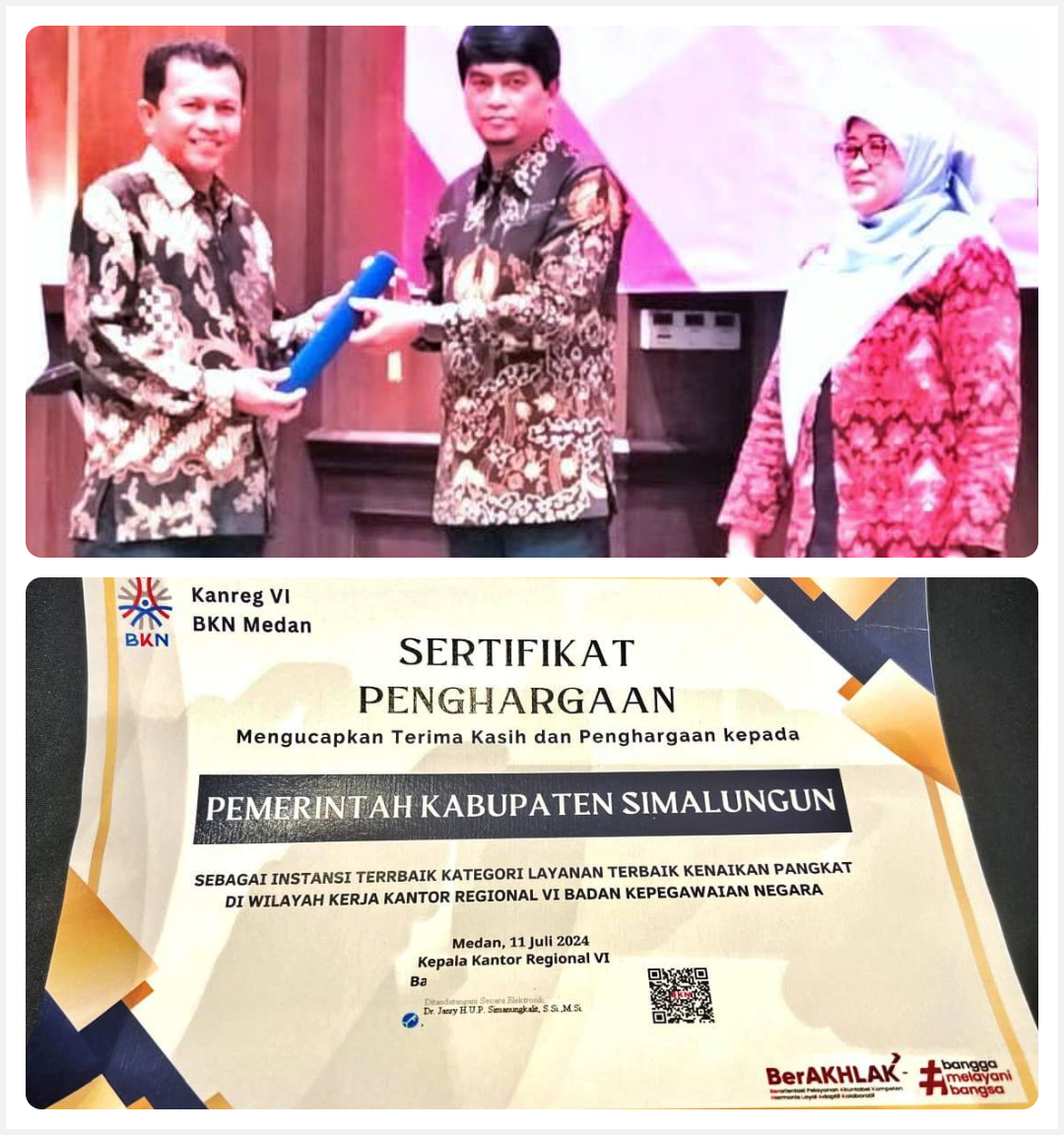 Kali ini, Pemkab Simalungun menerima penghargaan sebagai instansi terbaik kategori layanan terbaik kenaikan pangkat di Wilayah Kerja Kantor Regional IV Badan Kepegawaian Negara.