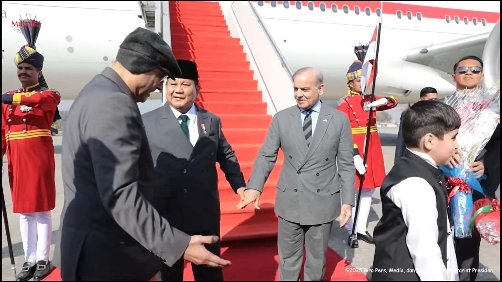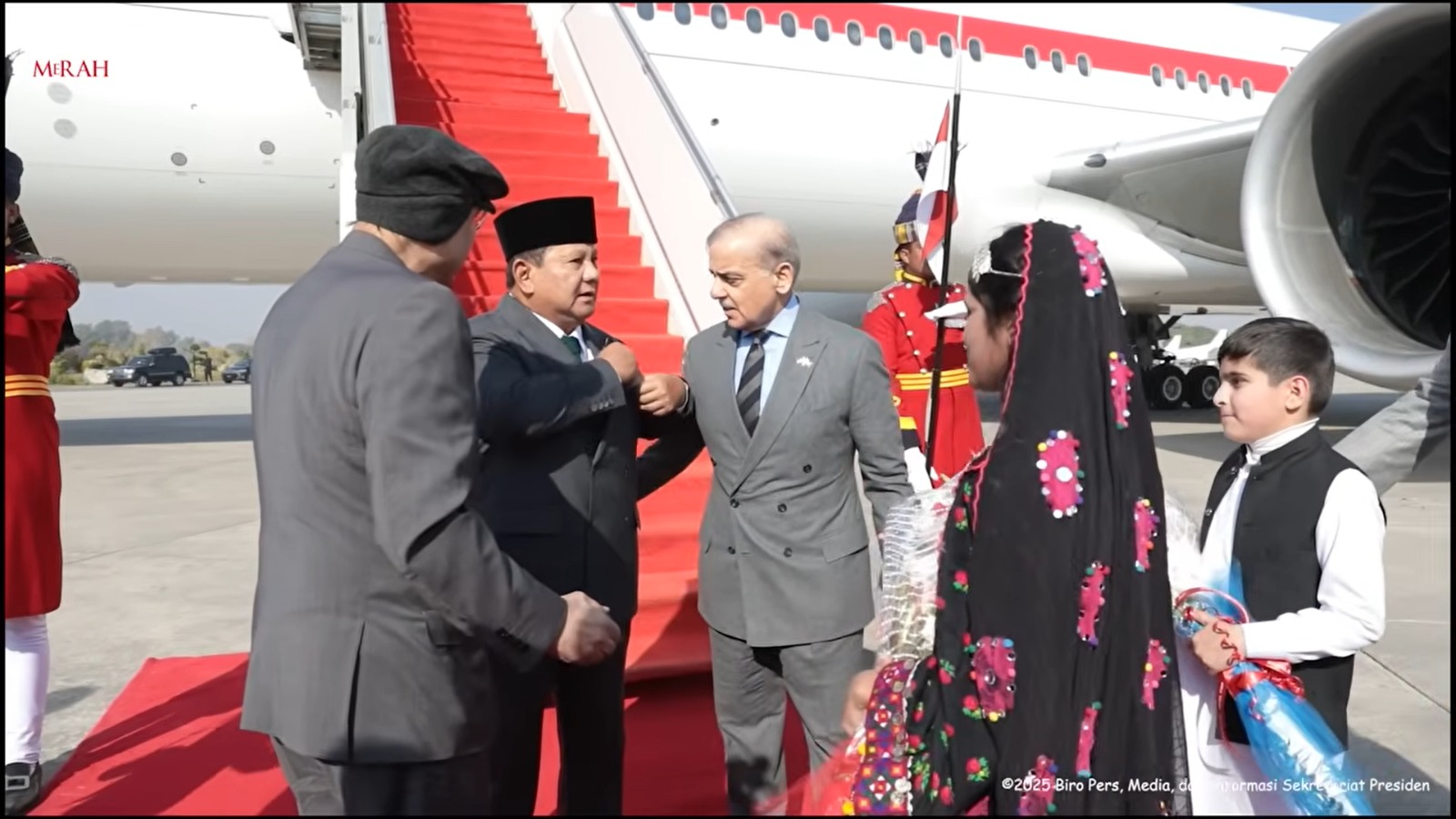 Menggunakan pesawat kepresidenan Garuda Indonesia-1, Presiden Prabowo dan delegasi mendapat penghormatan istimewa bahkan sebelum mendarat. Enam jet tempur JF-17 Thunder milik Angkatan Udara Pakistan mengawal pesawat kepresidenan saat memasuki wilayah udara Pakistan, sebuah tradisi khusus yang hanya diberikan kepada tamu negara setingkat kepala negara.