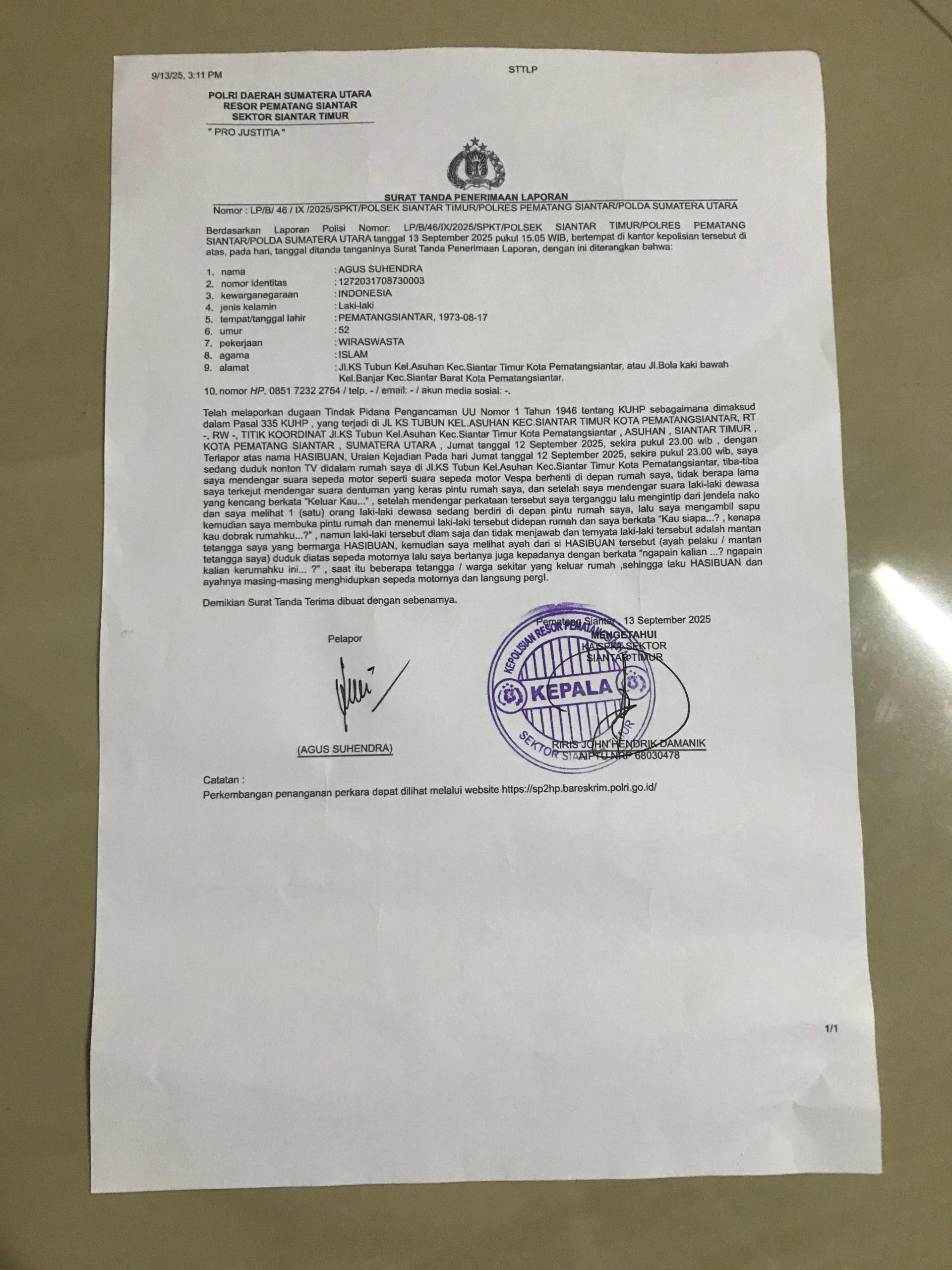 Lebih jauh, Agus mengaku sebelumnya telah menerima teror melalui pesan WhatsApp dari orang tak dikenal. Peristiwa tersebut membuat dirinya dan keluarga merasa terancam. Ia pun langsung membuat laporan ke Polsek Siantar Timur dengan nomor: LP/B/46/IX/2025/SPKT/POLSEK SIANTAR TIMUR.