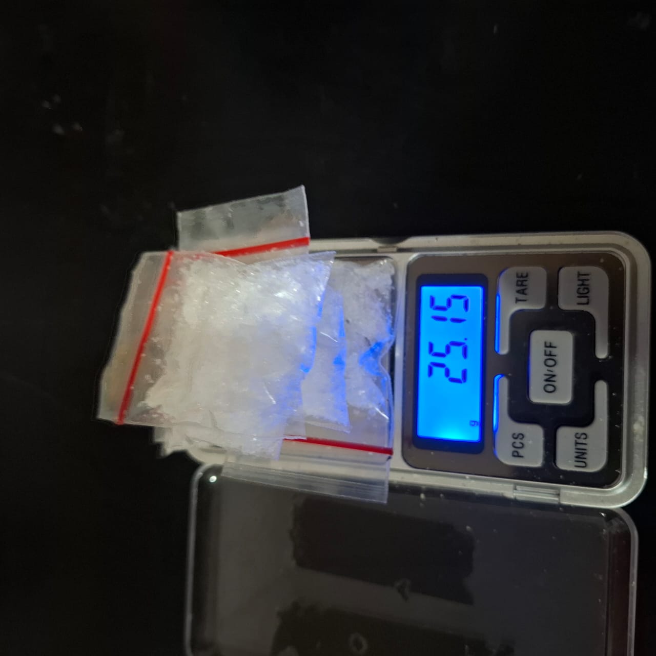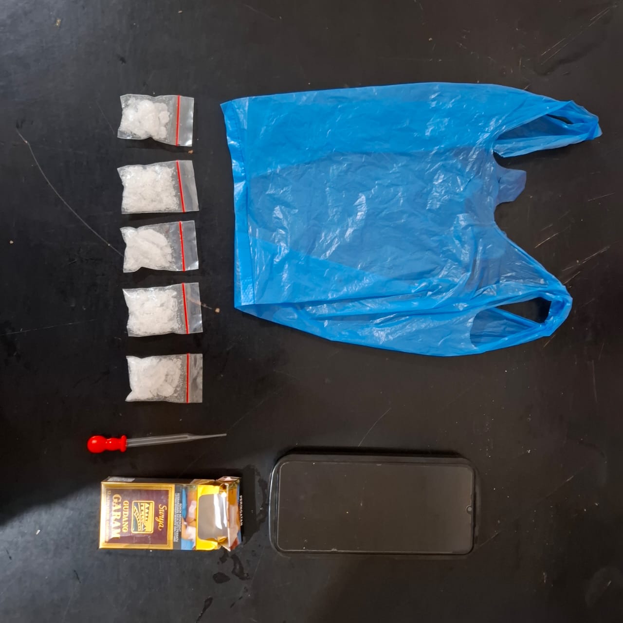 Dalam penggerebekan itu, polisi menyita lima klip plastik berisi sabu seberat total 25,15 gram, satu unit handphone merek Vivo berwarna ungu, satu kantong plastik kresek biru, serta satu bungkus rokok Surya kecil yang di dalamnya terdapat kaca pirex.