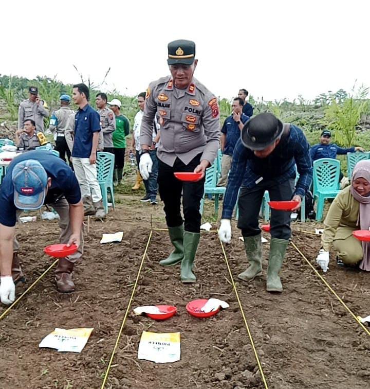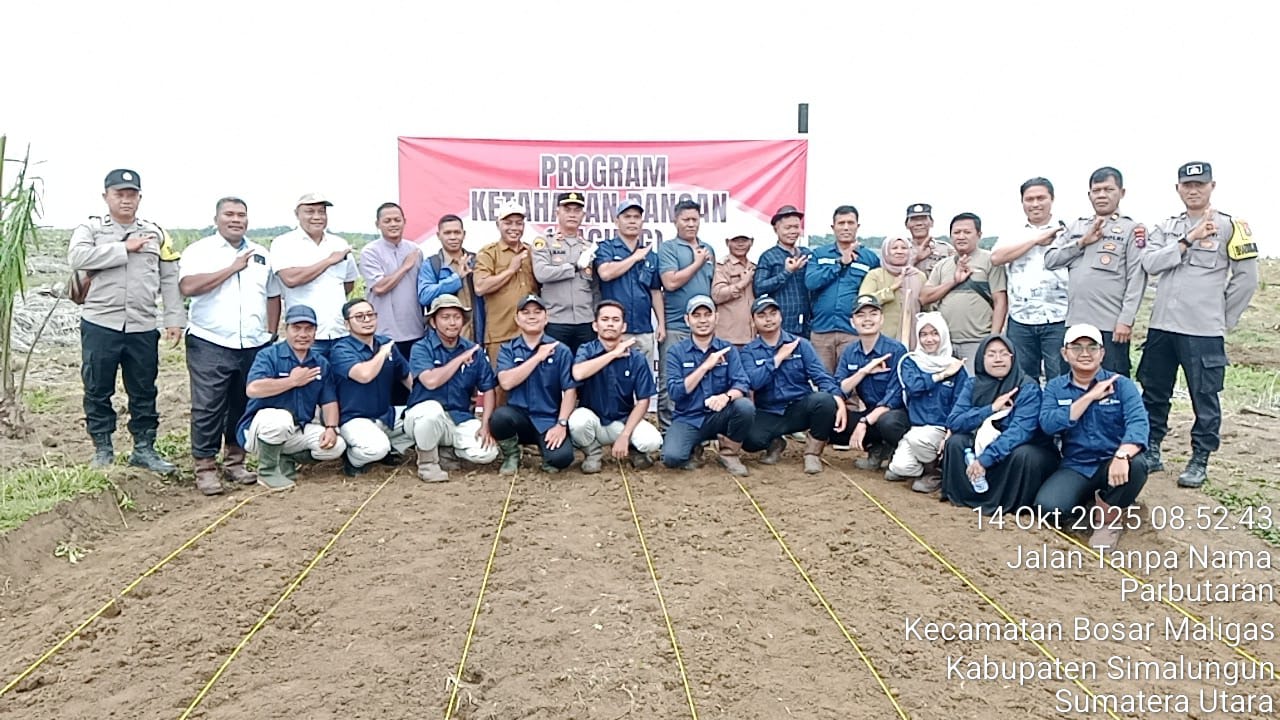 SIMALUNGUN – Polsek Bosar Maligas turut mengawal program ketahanan pangan nasional melalui kegiatan penanaman jagung di Afdeling II Kebun PTPN IV Regional II Mayang, Nagori Mayang, Kecamatan Bosar Maligas, Kabupaten Simalungun, Selasa (14/10/2025).
