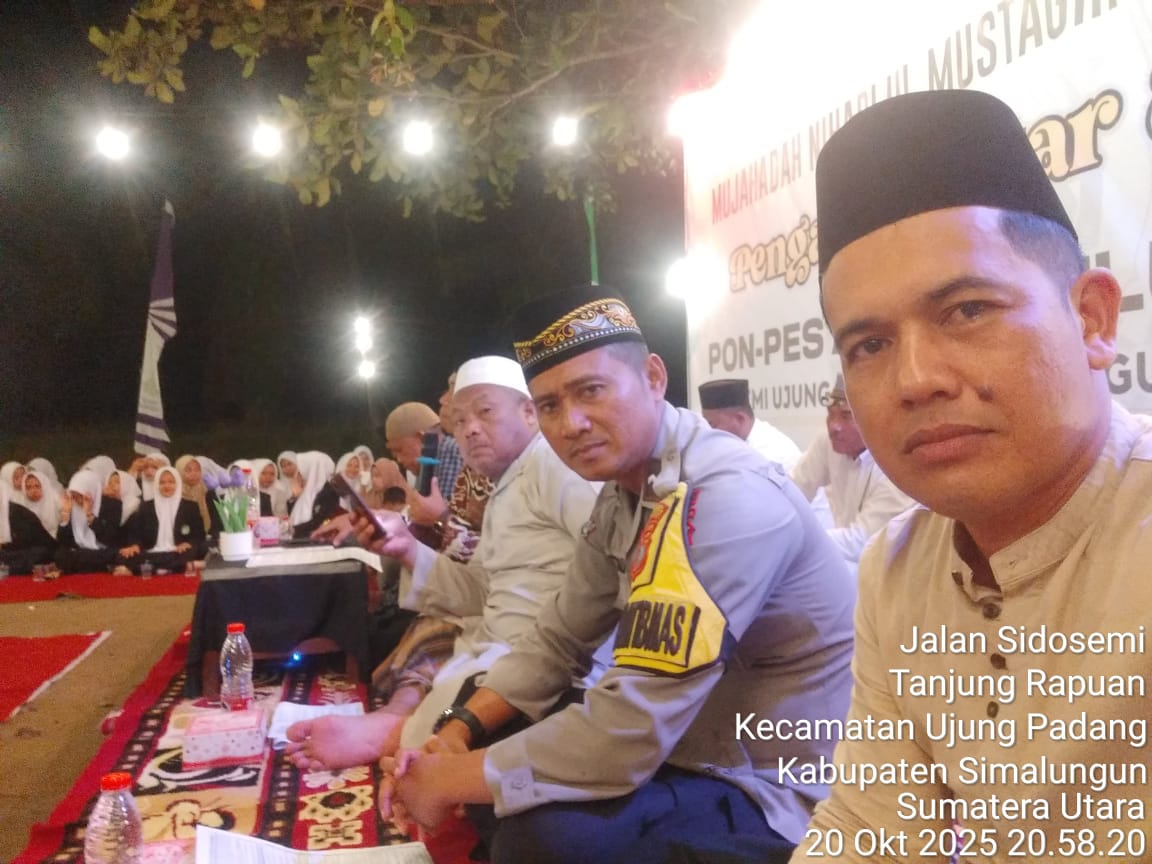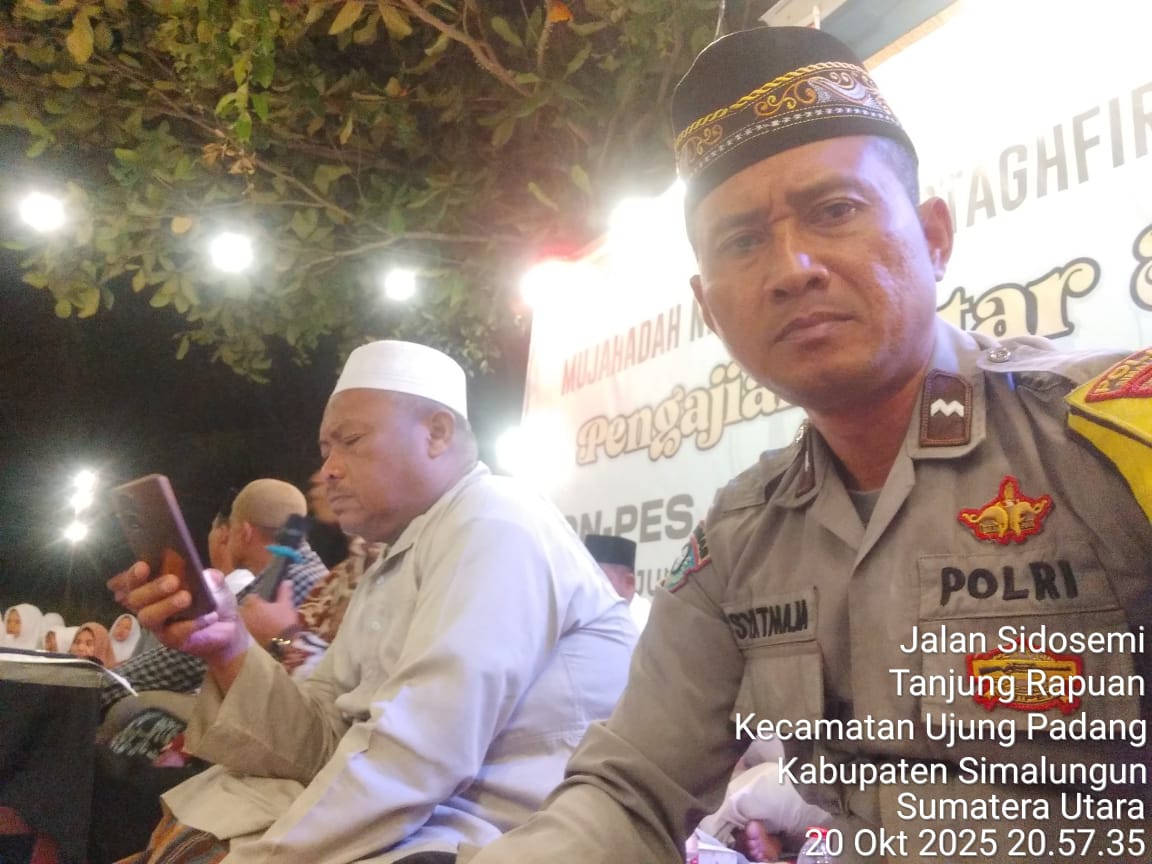 SIMALUNGUN – Dalam upaya mempererat sinergi antara aparat keamanan dan masyarakat, Bhabinkamtibmas Polsek Bosar Maligas, Aipda Surya Atmaja, menghadiri kegiatan Pengajian Latar Ngarep Mujahadah Nihadlul Mustaghfirin dan Sholawat di Pondok Pesantren Api Sabilussalam Sidosemi, Nagori Teluk Lapian, Kecamatan Ujung Padang, Kabupaten Simalungun, pada Senin (20/10/2025) malam, pukul 20.30 WIB hingga selesai.