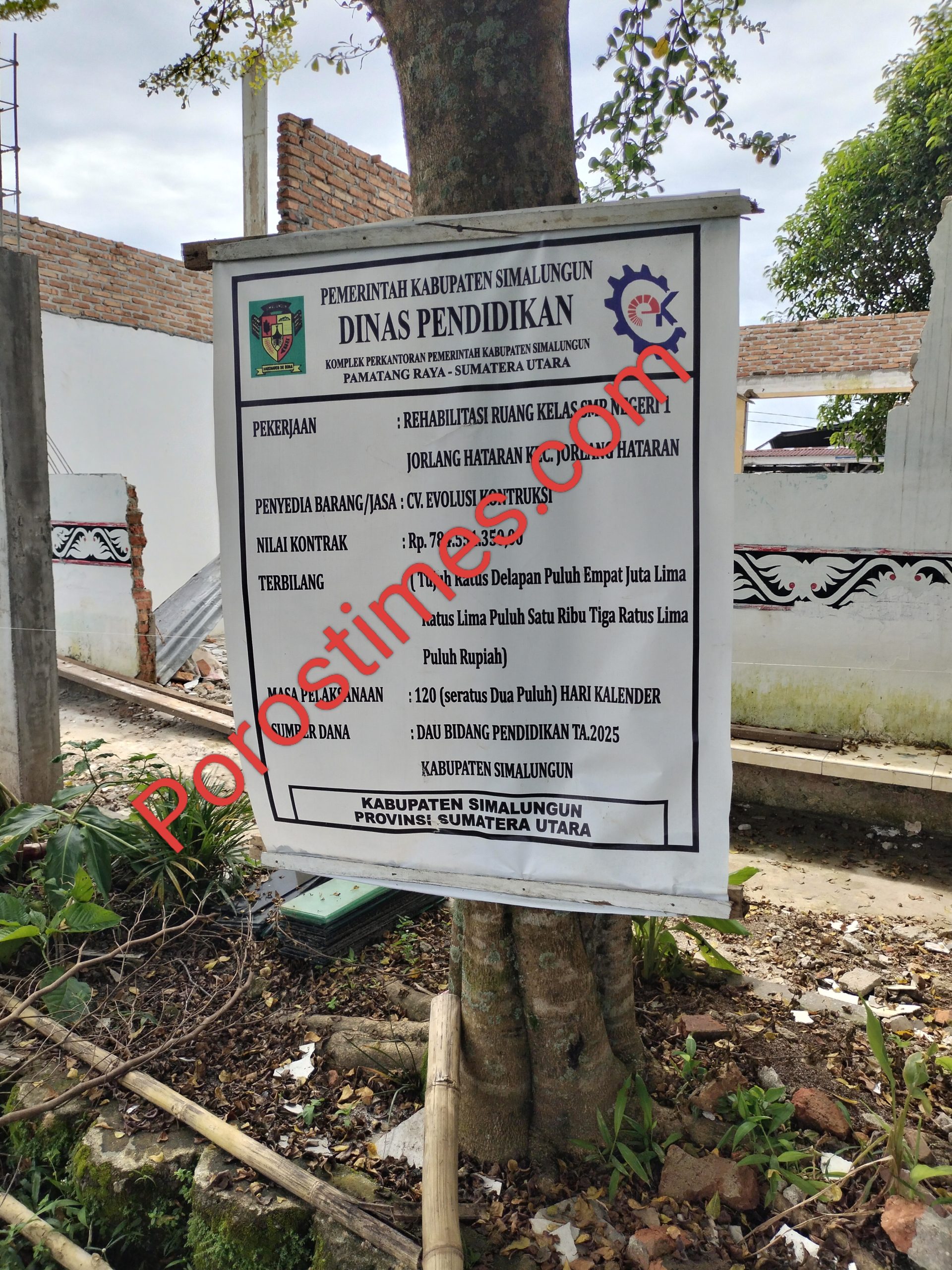 SIMALUNGUN – Proyek rehabilitasi ruang kelas di Sekolah Menengah Pertama Negeri (SMPN) 1 Jorlang Hataran, Kecamatan Jorlang Hataran, Kabupaten Simalungun, terhenti tanpa kejelasan. Pekerjaan yang merupakan program Dinas Pendidikan Kabupaten Simalungun itu kini mangkrak, tanpa aktivitas berarti di lapangan.