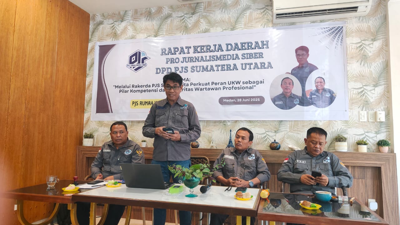 MEDAN – Dewan Pimpinan Daerah (DPD) Pro Jurnalismedia Siber (PJS) Sumatera Utara menggelar Rapat Kerja Daerah (Rakerda) I yang dibuka langsung oleh Ketua Umum Dewan Pimpinan Pusat (DPP) PJS, Mahmud Marhaba, bertempat di Deli Kede Kopi, Jalan Dolok Sanggul, Medan, Sabtu (28/6/2025).
