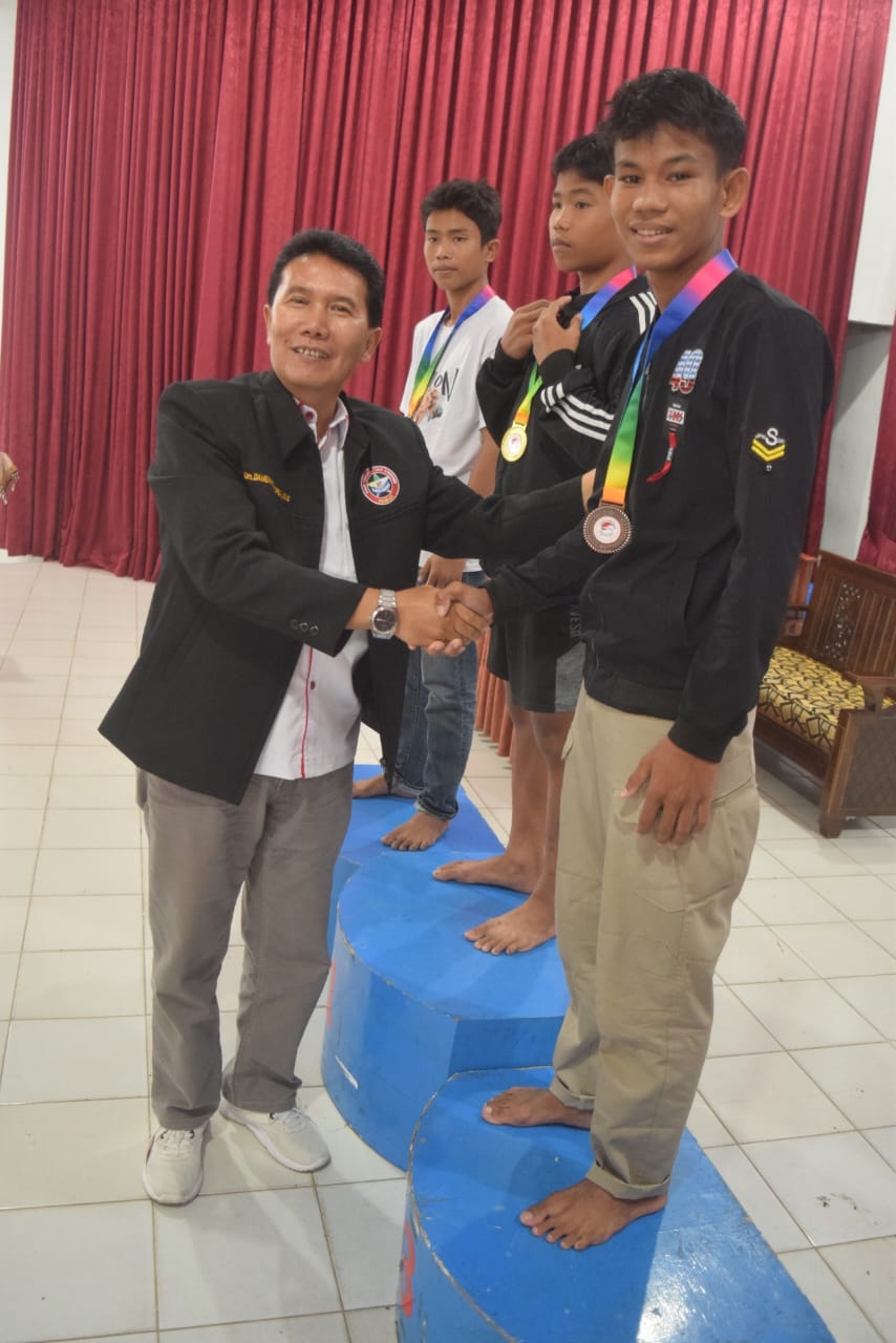 Ketua Pengkab Wushu Indonesia Kab Simalungun Drs Dameanto MSi saat menyerahkan Piala dan Tropy kepada atlet juara Wushu Sanda tingkat pelajar Se Kab Simalungun