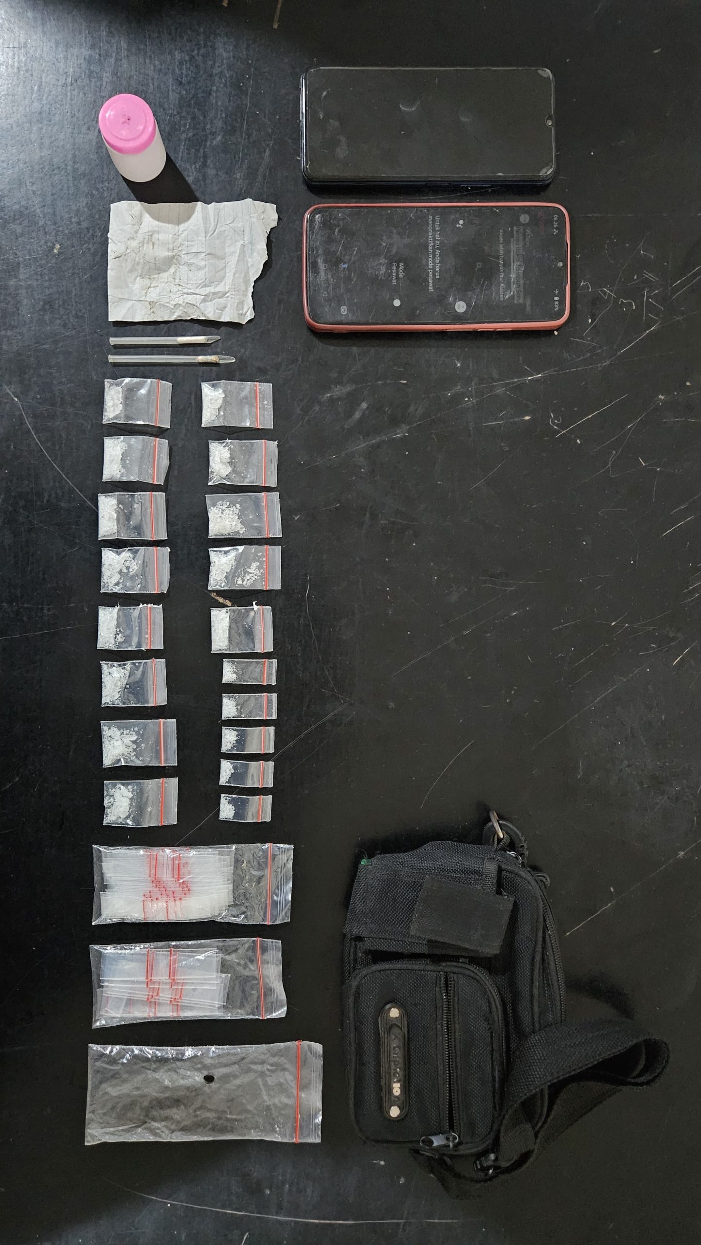 Penggerebekan dilakukan tepat pukul 20.00 WIB. Dari hasil penggeledahan, petugas menemukan 18 plastik klip berisi sabu dengan berat brutto 10,94 gram yang disimpan dalam tas pinggang kecil milik pelaku. Selain itu, diamankan pula dua unit handphone Android merk Vivo dan Realme, plastik klip kosong, sekop dari pipet, serta perlengkapan lain yang digunakan untuk mengemas sabu.