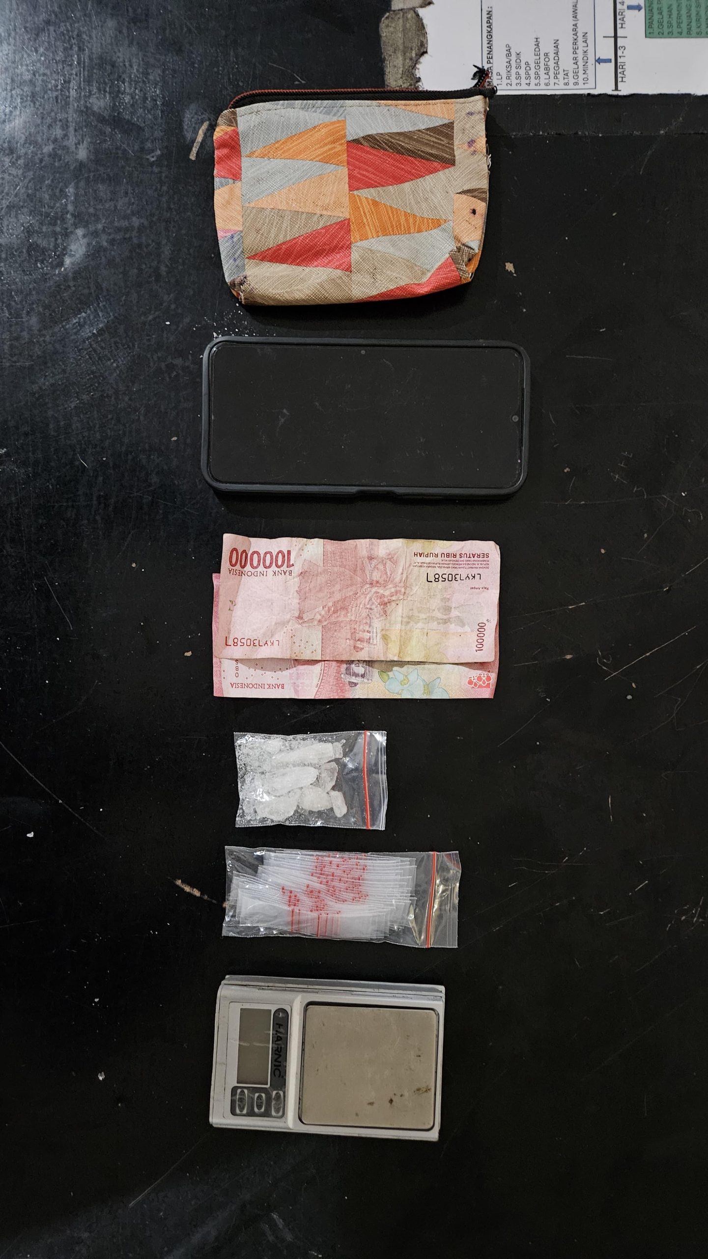 Dalam penggeledahan, polisi menemukan barang bukti berupa satu bungkus plastik klip besar berisi sabu seberat 8,74 gram, sebuah handphone Vivo warna hitam, uang tunai Rp200.000 diduga hasil transaksi, satu bal plastik klip kosong, dompet kecil, serta satu unit timbangan digital.