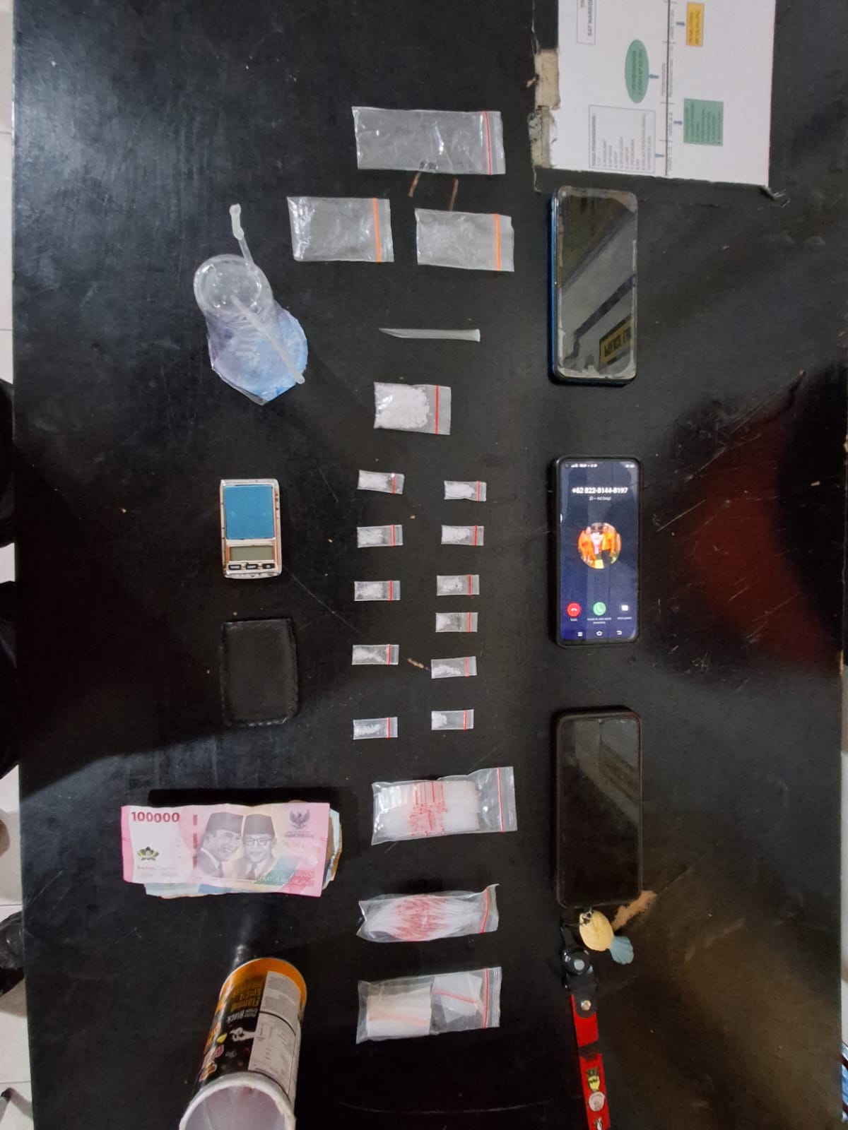 Dari hasil penggeledahan, petugas menemukan 12 paket plastik klip berisi sabu, dengan berat total 7,93 gram brutto, serta berbagai perlengkapan transaksi dan konsumsi sabu.