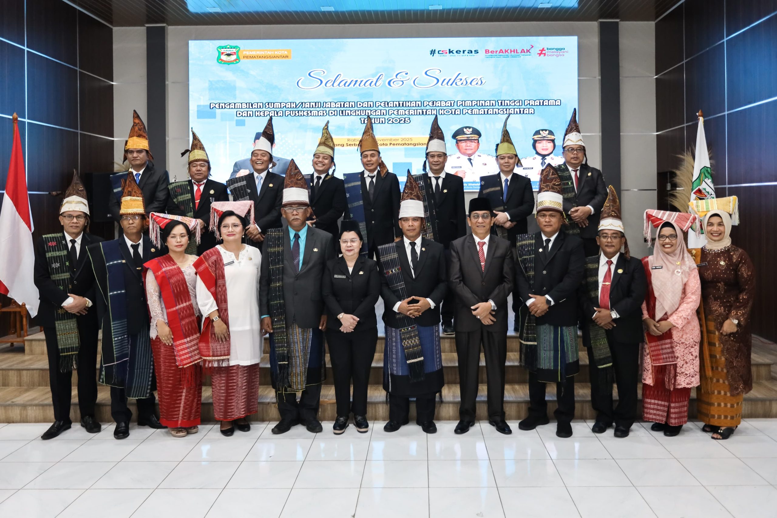 PEMATANGSIANTAR – Wali Kota Pematangsiantar Wesly Silalahi SH MKn, yang diwakili Sekretaris Daerah (Sekda) Junaedi Antonius Sitanggang SSTP MSi, memimpin Pengambilan Sumpah/Janji Jabatan 20 Pejabat Pimpinan Tinggi Pratama dan 1 Kepala Puskesmas di lingkungan Pemerintah Kota (Pemko) Pematangsiantar. Pelantikan berlangsung di Ruang Serbaguna Pemko Pematangsiantar, Rabu (19/11/2025) sore, dengan kehadiran pejabat secara langsung dan melalui zoom meeting.
