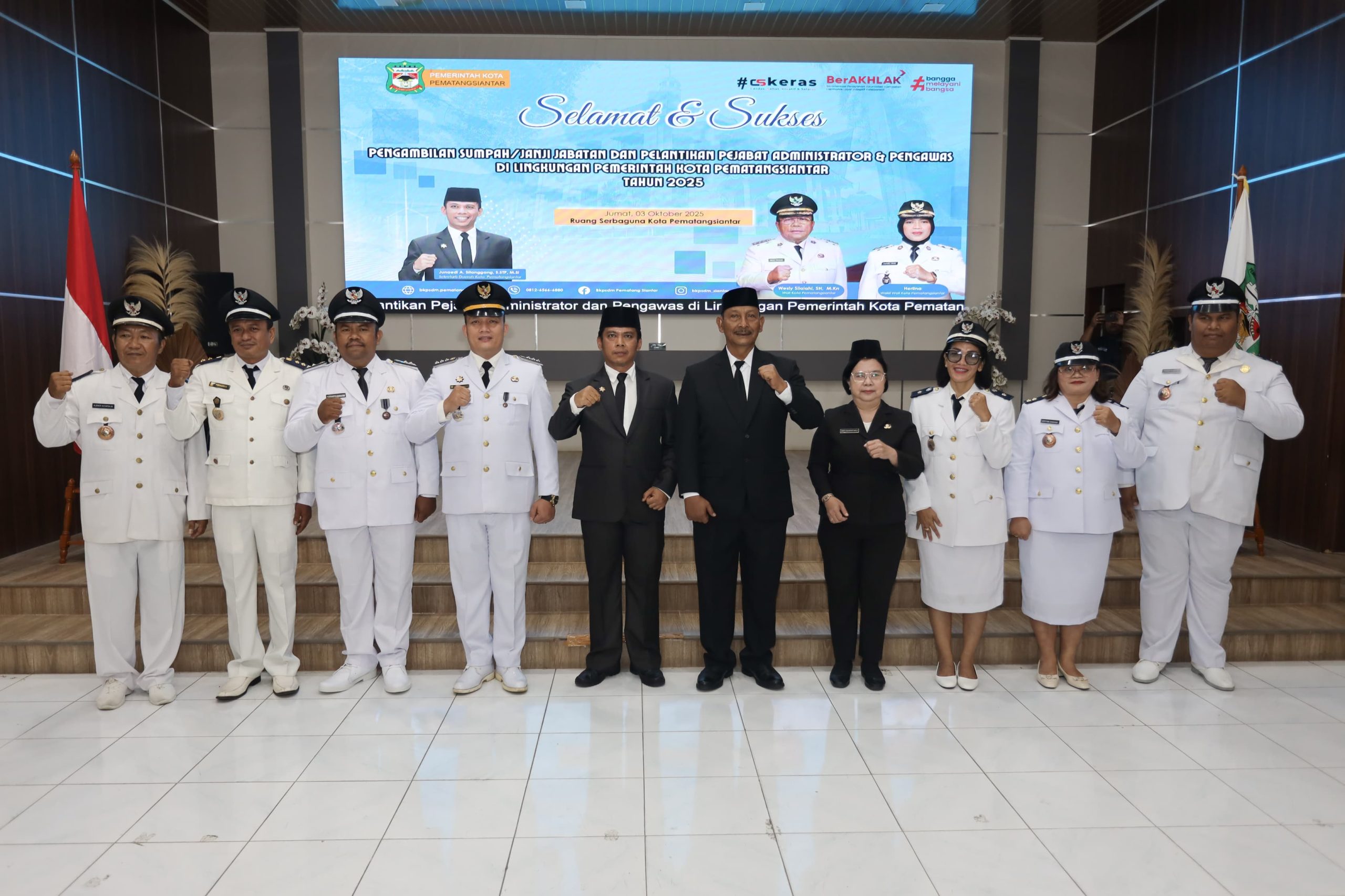“Bekerjalah dengan disiplin, berintegritas, dan profesional, tanpa membedakan jenis kelamin, suku, agama, ras, maupun golongan. Terimalah jabatan ini sebagai amanah untuk memberikan kontribusi terbaik bagi pembangunan Kota Pematangsiantar,” pesan Wesly.