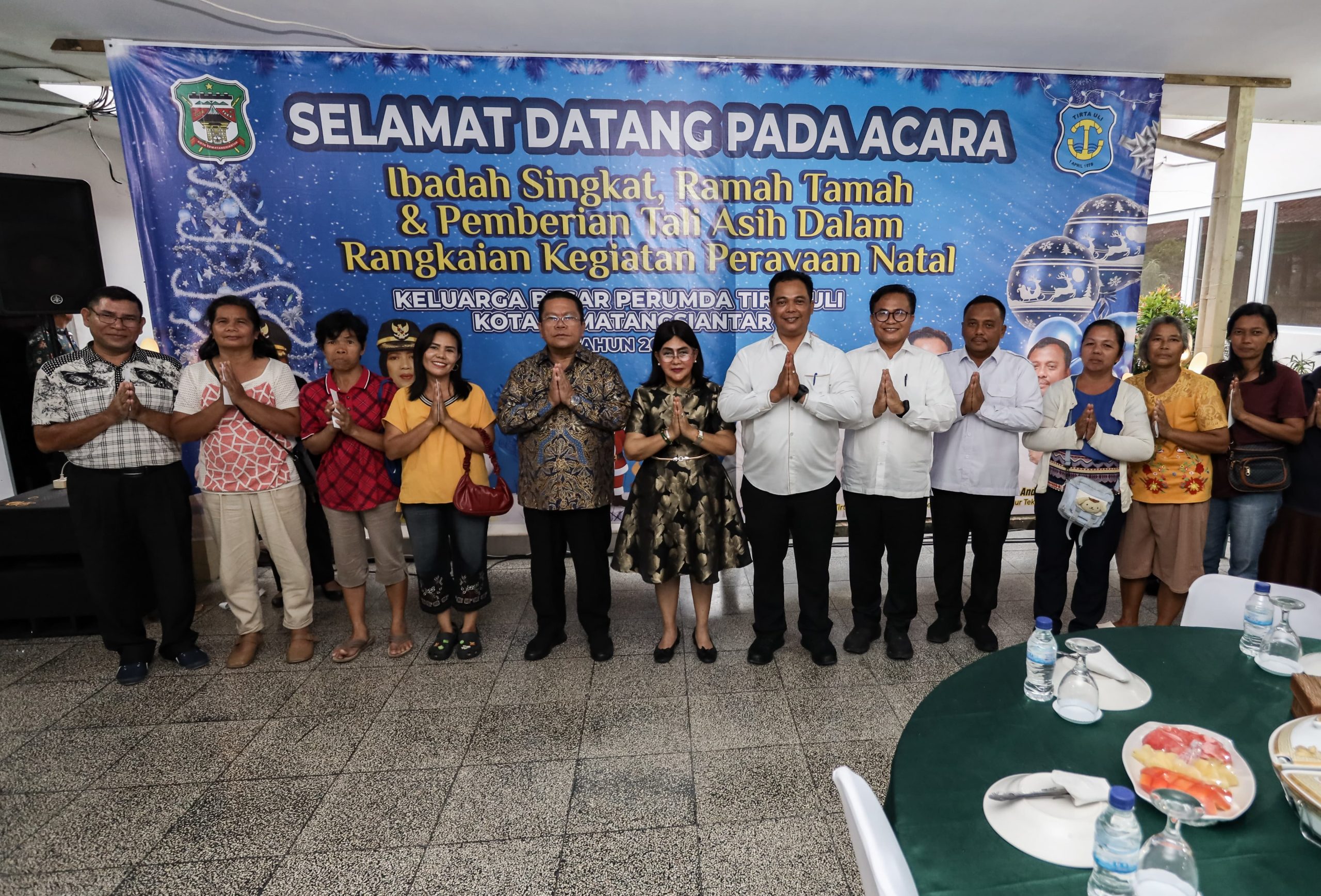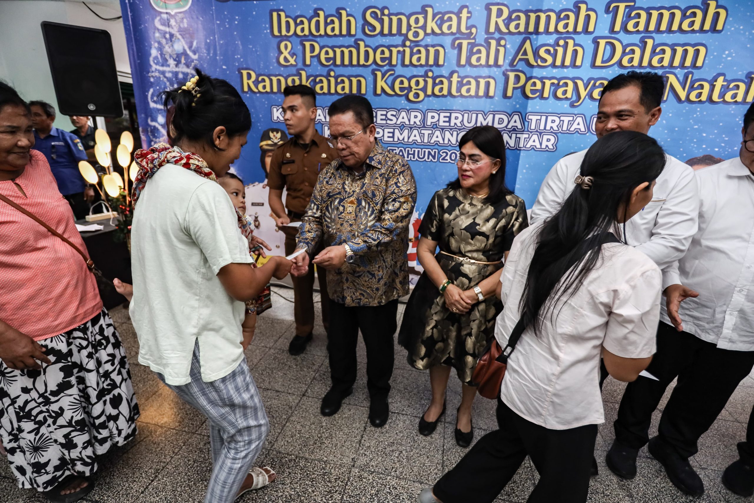 PEMATANGSIANTAR – Wali Kota Pematangsiantar Wesly Silalahi SH MKn, didampingi Ketua TP PKK Ny Liswati Wesly Silalahi, menyerahkan tali asih kepada jemaat gereja sebagai bagian dari rangkaian Perayaan Natal Keluarga Besar Perusahaan Umum Daerah (Perumda) Air Minum Tirta Uli. Kegiatan berlangsung di rumah dinas wali kota, Jalan MH Sitorus, Kelurahan Teladan, Kecamatan Siantar Barat, Selasa (02/12/2025).