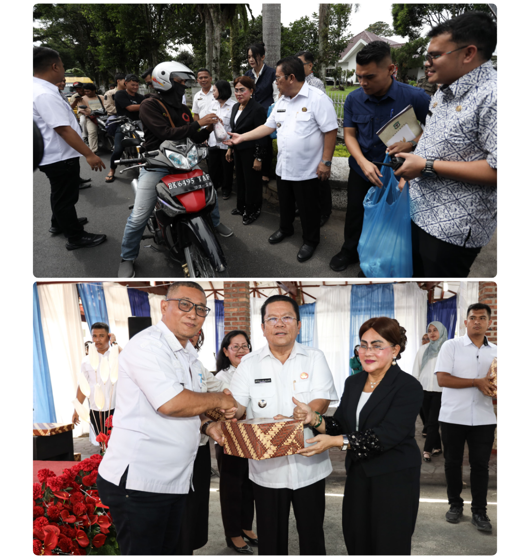 Sebelum acara dimulai, Wali Kota Wesly Silalahi bersama Ketua TP PKK Ny Liswati Wesly Silalahi, Sekda Junaedi Antonius Sitanggang, serta pimpinan OPD membagikan nasi bungkus kepada para pengguna jalan di Jalan MH Sitorus, tepat di depan rumah dinas wali kota.(Ril)