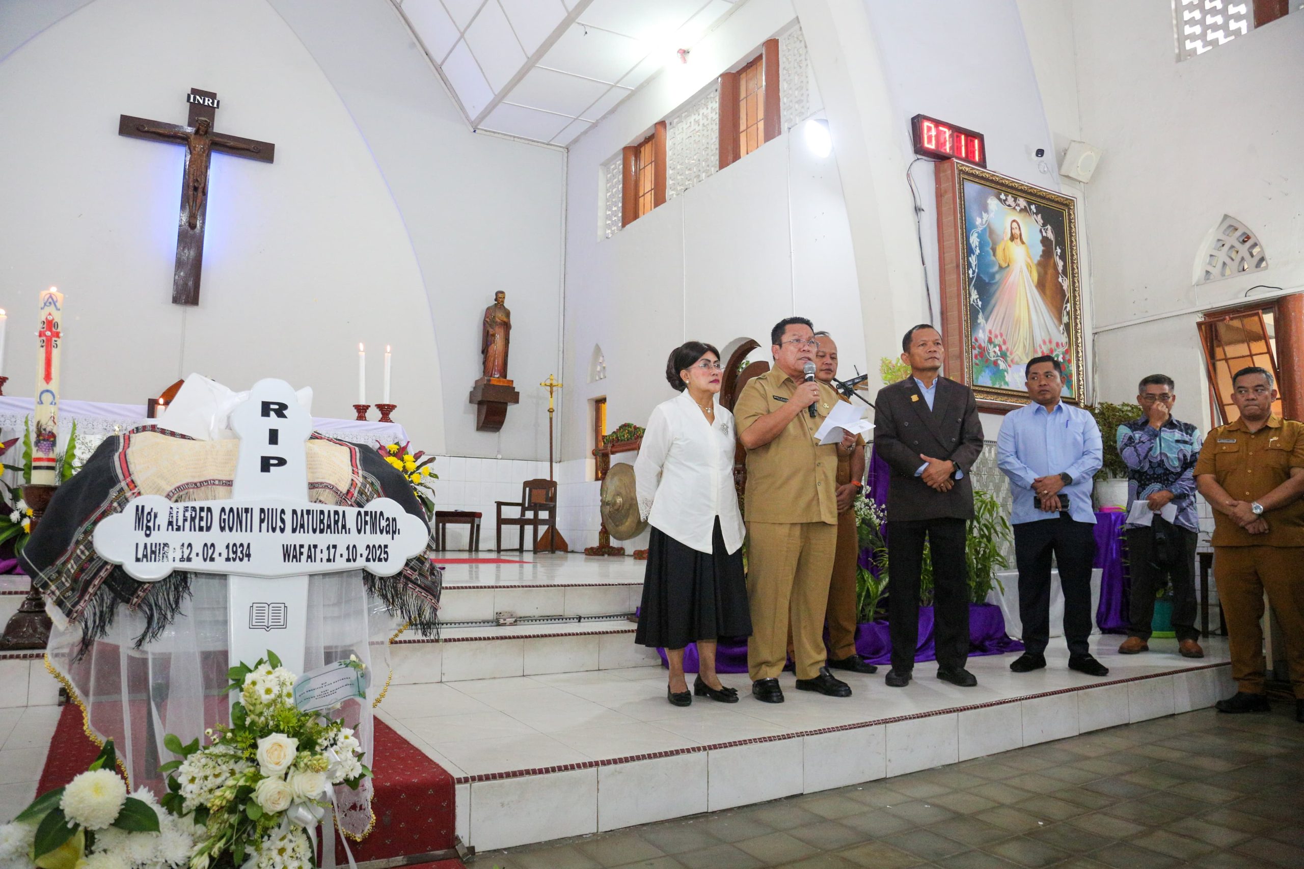 “Hari ini kita diberi kesempatan untuk menyampaikan penghormatan terakhir kepada seorang gembala yang sangat kita hormati dan kasihi, Uskup Emeritus Mgr. Alfred Gonti Pius Datubara, OFMCap,” ujar Wesly.