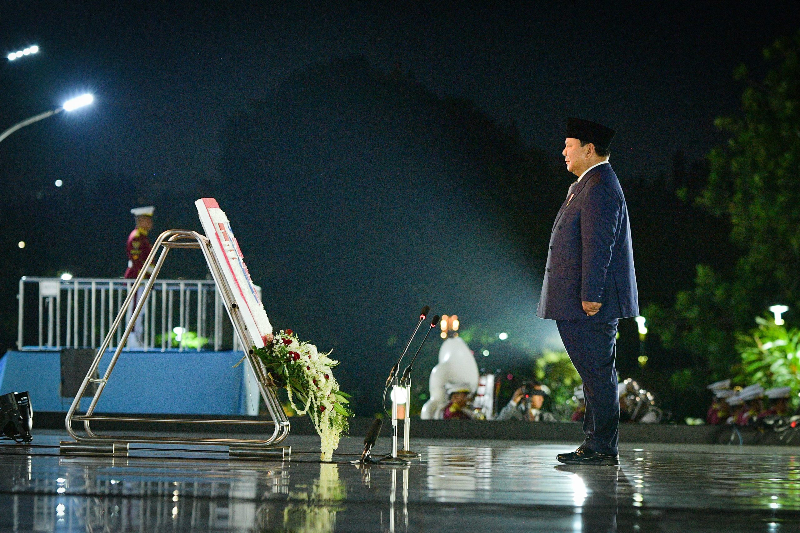 “Marilah kita mengenang arwah dan jasa para pahlawan yang telah gugur membela kemerdekaan, kedaulatan, dan kehormatan bangsa Indonesia, khususnya mereka yang gugur dalam perlawanan terhadap kekuatan asing,” ujar Presiden Prabowo dalam amanatnya.